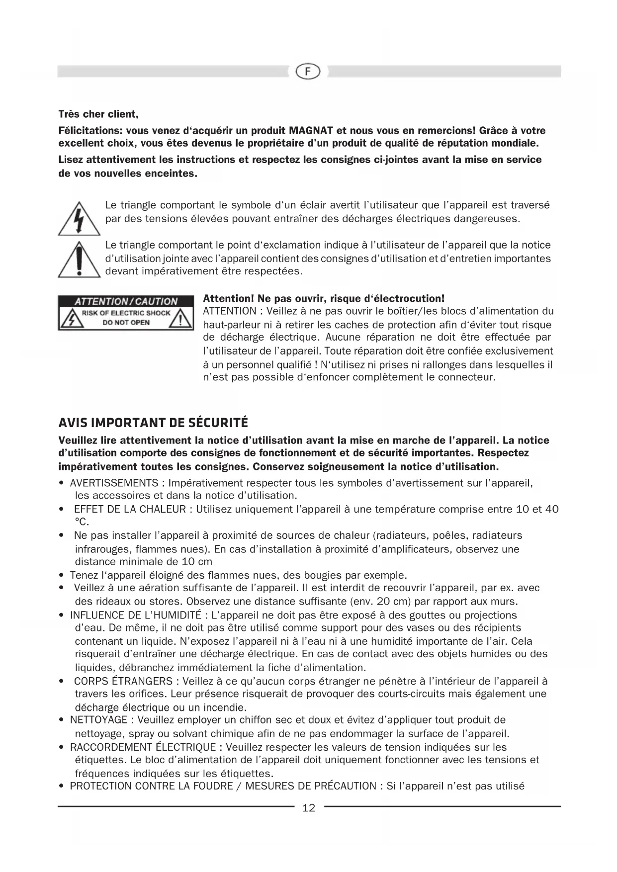 - Disposing of batteries Old batteries are hazardous waste and must be disposed of in accordance with current regulations. Power (12) Switches the device on when it is in the standby mode. If the LED does not illuminate, actuate the power switch located on the rear of the device. Conversely the device can be switched from power operation to the standby mode. Volume (13) You can use this button to increase ( ) or to decrease ( ) the volume of the music. MAINTENANCE Please use a soft, dry cloth with no cleaning agents, sprays or chemical solvents, as these could damage the surfaces. SPECIFICATIONS Configuration: Powered bass reflex subwoofer, „downfire“ principle Fitted with 38 cm long-stroke driver Output power RMS/Max.: 150 / 300 watts Frequency range: 17 – 200 Hz Cross-over frequency: 50 – 150 Hz, adjustable Dimensions (WxHxD): 458 x 545 x 620 mm Accessories: mains cable Subject to technical change.12 Très cher client, Félicitations: vous venez d‘acquérir un produit MAGNAT et nous vous en remercions! Grâce à votre excellent choix, vous êtes devenus le propriétaire d’un produit de qualité de réputation mondiale. Lisez attentivement les instructions et respectez les consignes ci-jointes avant la mise en service de vos nouvelles enceintes. Le triangle comportant le symbole d‘un éclair avertit l’utilisateur que l’appareil est traversé par des tensions élevées pouvant entraîner des décharges électriques dangereuses. Le triangle comportant le point d‘exclamation indique à l’utilisateur de l’appareil que la notice d’utilisation jointe avec l’appareil contient des consignes d’utilisation et d’entretien importantes devant impérativement être respectées. Attention! Ne pas ouvrir, risque d‘électrocution! ATTENTION : Veillez à ne pas ouvrir le boîtier/les blocs d’alimentation du haut-parleur ni à retirer les caches de protection afin d‘éviter tout risque de décharge électrique. Aucune réparation ne doit être effectuée par l’utilisateur de l’appareil. Toute réparation doit être confiée exclusivement à un personnel qualifié ! N‘utilisez ni prises ni rallonges dans lesquelles il n’est pas possible d‘enfoncer complètement le connecteur.