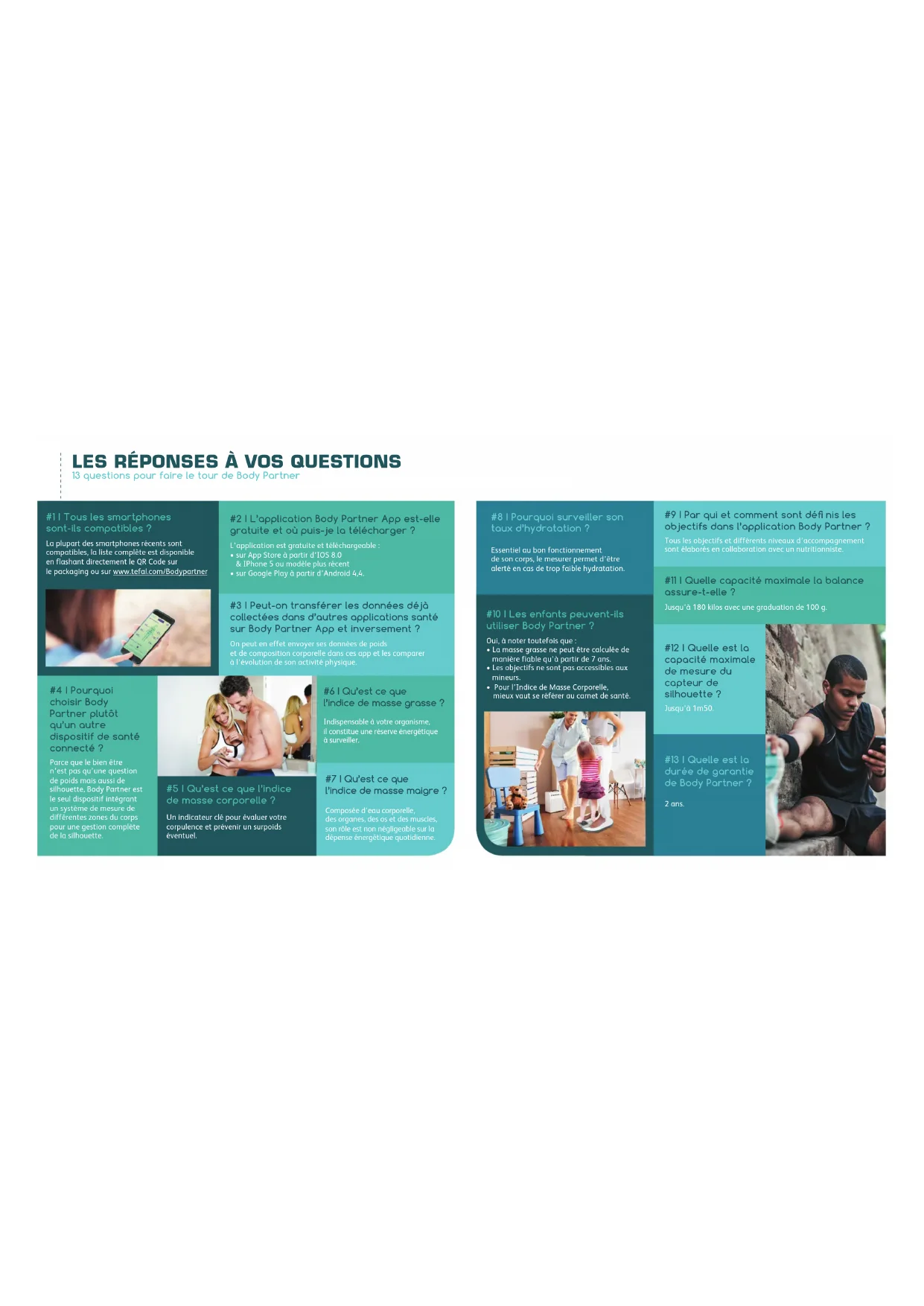 13 questions pour faire le tour de Body Partner #1 I Tous les smartphones sont-ils compatibles ? La plupart des smartphones récents sont compatibles, la liste complète est disponible en flashant directement le QR Code sur le packaging ou sur www.tefal.com/Bodypartner #2 I L’application Body Partner App est-elle gratuite et où puis-je la télécharger ? L’application est gratuite et téléchargeable :