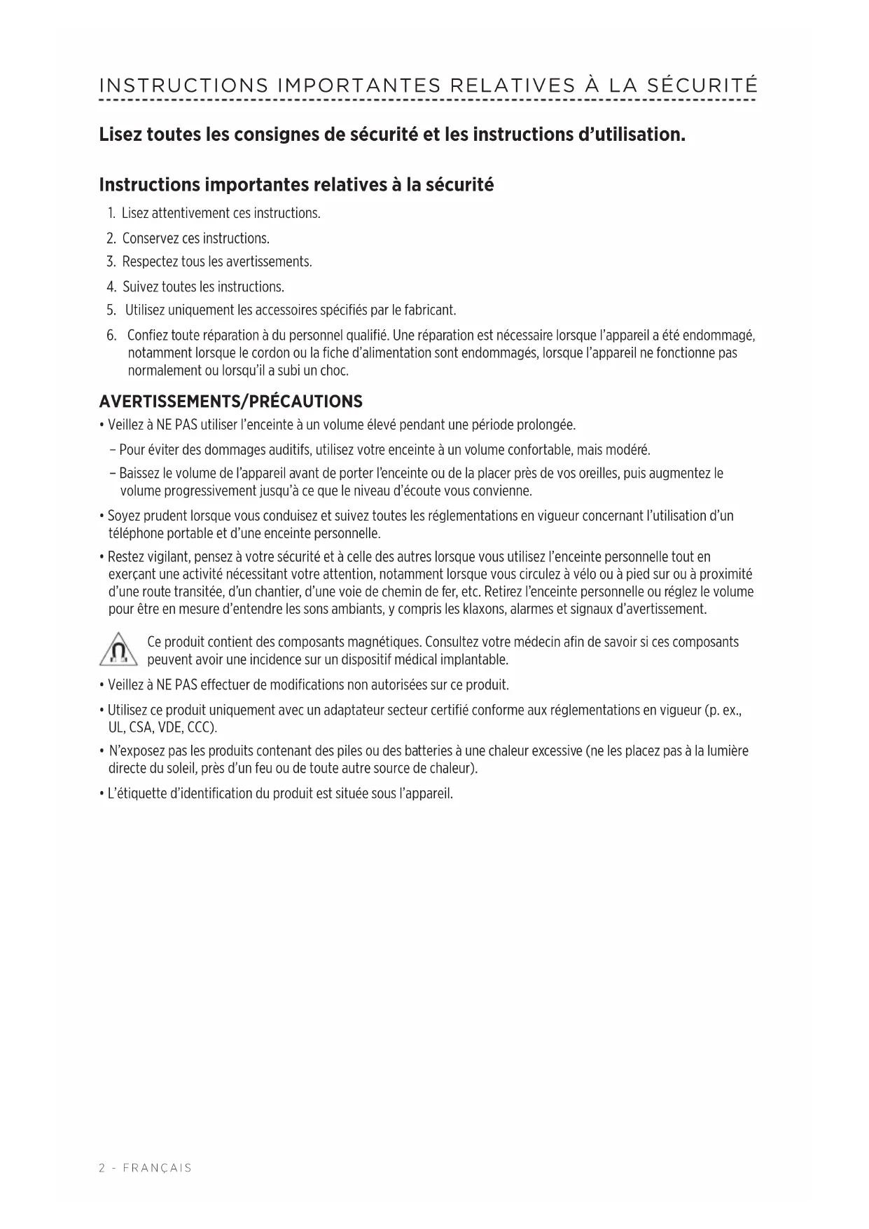 - Restez vigilant, pensez à votre sécurité et à celle des autres lorsque vous utilisez l’enceinte personnelle tout en exerçant une activité nécessitant votre attention, notamment lorsque vous circulez à vélo ou à pied sur ou à proximité d’une route transitée, d’un chantier, d’une voie de chemin de fer, etc. Retirez l’enceinte personnelle ou réglez le volume pour être en mesure d’entendre les sons ambiants, y compris les klaxons, alarmes et signaux d’avertissement. Ce produit contient des composants magnétiques. Consultez votre médecin afin de savoir si ces composants peuvent avoir une incidence sur un dispositif médical implantable.