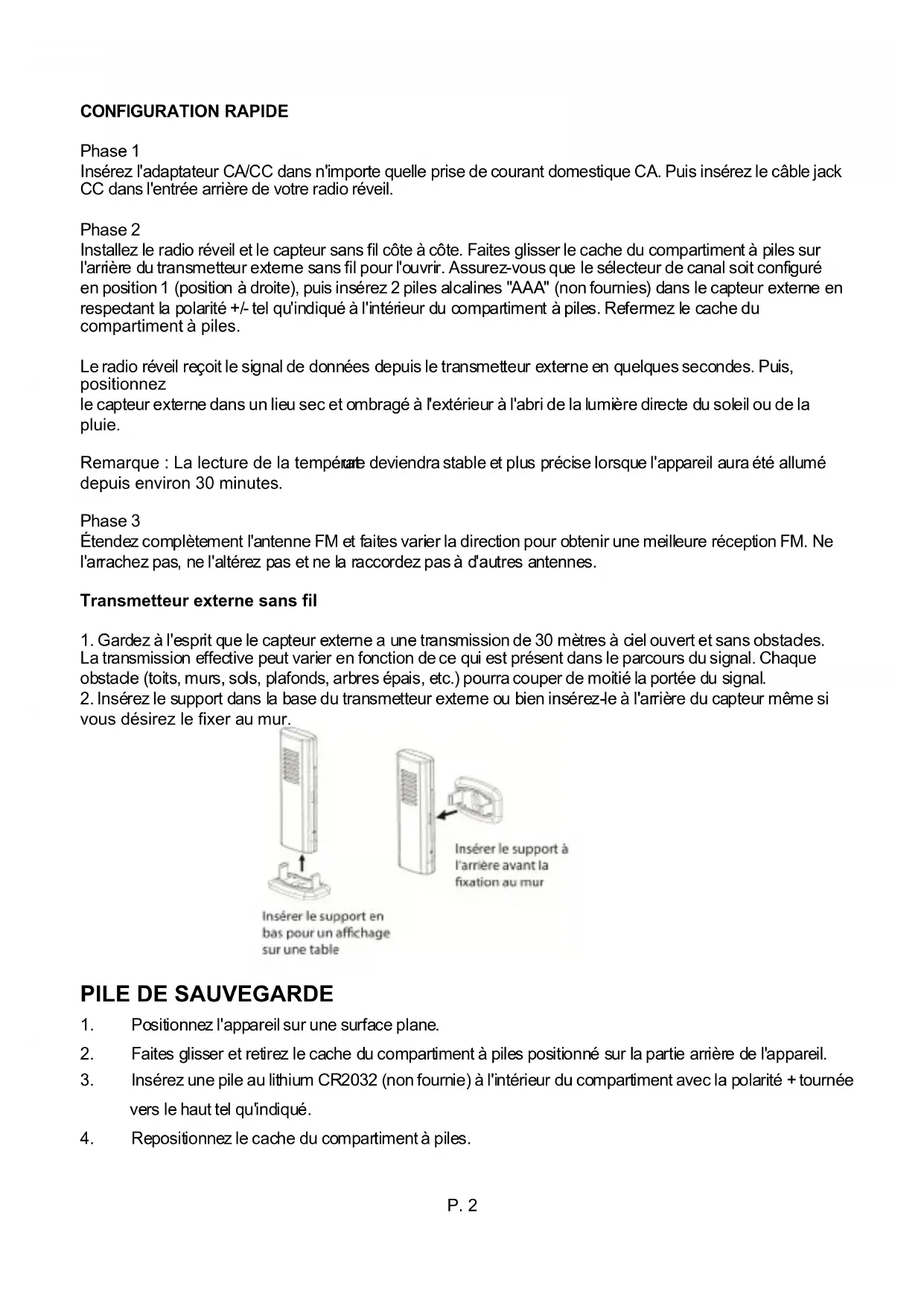 Si l'alimentation CC est interrompue, l'écran s'éteint et la radio et l'alarme ne fonctionneront pas. La pile de sauvegarde conservera l'heure ainsi que toutes les configurations de votre appareil. Assurez-vous d'utiliser une pile au lithium CR2032 neuve. Une pile CR2032 neuve peut effectuer la sauvegarde de l'heure en continu pendant environ 3 jours.
