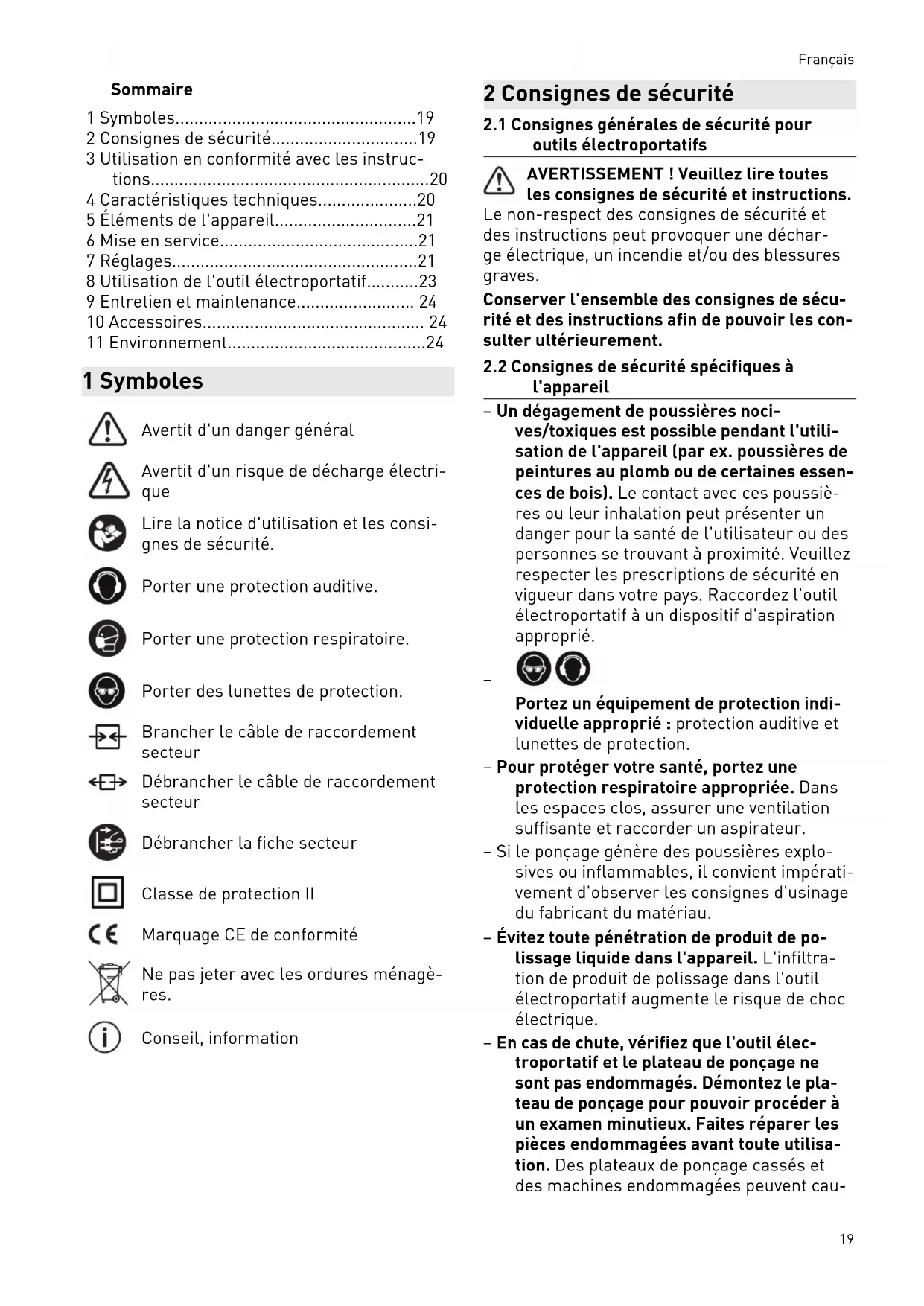 Portez un équipement de protection indi viduelle approprié: protection auditive et lunettes de protection. – Pour protéger votre santé, portez une protection respiratoire appropriée. Dans les espaces clos, assurer une ventilation suffisante et raccorder un aspirateur. – Si le ponçage génère des poussières explo sives ou inflammables, il convient impérati vement d'observer les consignes d'usinage du fabricant du matériau. – Évitez toute pénétration de produit de po lissage liquide dans l'appareil. L'infiltra tion de produit de polissage dans l'outil électroportatif augmente le risque de choc électrique. – En cas de chute, vérifiez que l'outil élec troportatif et le plateau de ponçage ne sont pas endommagés. Démontez le pla teau de ponçage pour pouvoir procéder à un examen minutieux. Faites réparer les pièces endommagées avant toute utilisa tion. Des plateaux de ponçage cassés et des machines endommagées peuvent cau Français 19ser des blessures et compromettre la sé curité d'utilisation de la machine. – Nettoyez à l'eau les accessoires impré gnés d'huile, par ex. éponge de ponçage ou feutre de polissage, et laissez-les sé cher après les avoir soigneusement dé pliés. Les accessoires imprégnés d'huile peuvent s'enflammer d'eux-mêmes.