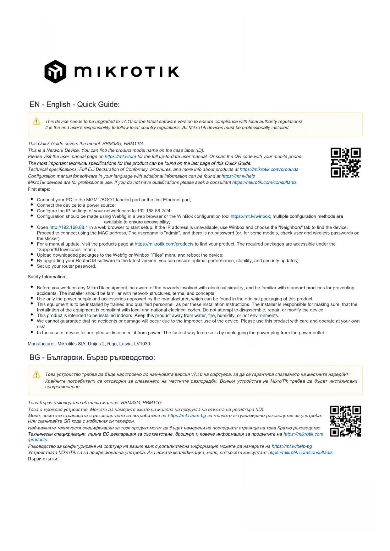Ceci est un périphérique réseau. Vous pouvez trouver le nom du modèle du produit sur l'étiquette du boîtier (ID). Veuillez visiter la page du manuel d'utilisation sur pour le manuel d'utilisation complet et à jour.https://mt.lv/um-fr Ou scannez le code QR avec votre téléphone portable. Les spécifications techniques les plus importantes de ce produit se trouvent sur la dernière page de ce guide rapide. Spécifications techniques, déclaration de conformité UE complète, brochures et plus d'informations sur les produits sur https://mikrotik.com /products Vous trouverez le manuel de configuration du logiciel dans votre langue avec des informations supplémentaires sur https://mt.lv/help-fr Les appareils MikroTik sont destinés à un usage professionnel. Si vous n'avez pas de qualifications, veuillez consulter un consultant https://mikrotik.com /consultants Premiers pas: Tämä laite on päivitettävä uusimpaan ohjelmistoversioon v7.10, jotta voidaan varmistaa paikallisten viranomaisten määräysten noudattaminen! Loppukäyttäjien vastuulla on noudattaa paikallisia maalakeja . Kaikki MikroTik-laitteet on asennettava ammattimaisesti. Cet appareil doit être mis à niveau vers la dernière version v7.10 du logiciel pour garantir la conformité aux réglementations des autorités locales! Il est de la responsabilité des utilisateurs finaux de suivre les réglementations locales du pays . Tous les appareils MikroTik doivent être installés par des professionnels.Connectez votre PC au port marqué MGMT/BOOT ou au premier port Ethernet; Connectez l'appareil à une source d'alimentation ; Configurez les paramètres IP de votre carte réseau à 192.168.88.2/24 ; La configuration doit être effectuée à l'aide de Webfig dans un navigateur web ou de l'outil de configuration WinBoxhttps://mt.lv/winbox; plusieurs méthodes de configuration sont disponibles pour garantir l’accessibilité ; Ouvrez dans un navigateur Web pour démarrer la configuration. Si l'adresse IP n'est pas disponible, utilisez Winbox et sélectionnez http://192.168.88.1 l'onglet "Neighbors" pour trouver le périphérique. Procédez à la connexion en utilisant l'adresse MAC. Le nom d'utilisateur est "admin", et il n'y a pas de mot de passe (ou, pour certains modèles, vérifiez les mots de passe utilisateur et sans fil sur l'autocollant) ; Pour une mise à jour manuelle, visitez la page des produits sur pour trouver votre produit. Les packages requis sont accessibles https://mikrotik.com/products dans le menu "Support&Downloads" ; Téléchargez les packages téléchargés dans le menu "Files" de Webfig ou Winbox et redémarrez l'appareil ; En mettant à jour votre logiciel RouterOS à la dernière version, vous pouvez assurer des performances optimales, la stabilité et des mises à jour de sécurité ; Configurez le mot de passe de votre routeur. Information sur la sécurité: Avant de travailler sur un équipement MikroTik, soyez conscient des dangers liés aux circuits électriques et familiarisez-vous avec les pratiques standard de prévention des accidents.Le programme d'installation doit être familiarisé avec les structures, les termes et les concepts du réseau. Utilisez uniquement l'alimentation et les accessoires approuvés par le fabricant et qui se trouvent dans l'emballage d'origine de ce produit. Cet équipement doit être installé par du personnel formé et qualifié, conformément à ces instructions d'installation.L'installateur est responsable de s'assurer que l'installation de l'équipement est conforme aux codes électriques locaux et nationaux. N'essayez pas de démonter, réparer ou modifier l'appareil. Ce produit est destiné à être installé à l'intérieur.Gardez ce produit loin de l'eau, du feu, de l'humidité ou des environnements chauds. Nous ne pouvons garantir qu'aucun accident ou dommage ne se produira en raison d'une mauvaise utilisation de l'appareil.Veuillez utiliser ce produit avec soin et l'utiliser à vos propres risques! En cas de panne de l'appareil, veuillez le déconnecter de l'alimentation.La façon la plus rapide de le faire est de débrancher la fiche d'alimentation de la prise de courant. Fabricant: Mikrotikls SIA, Unijas 2, Riga, Lettonie, LV1039. HR - Hrvatski. Brzi vodič: Ovaj brzi vodič pokriva model: RBM33G, RBM11G.
