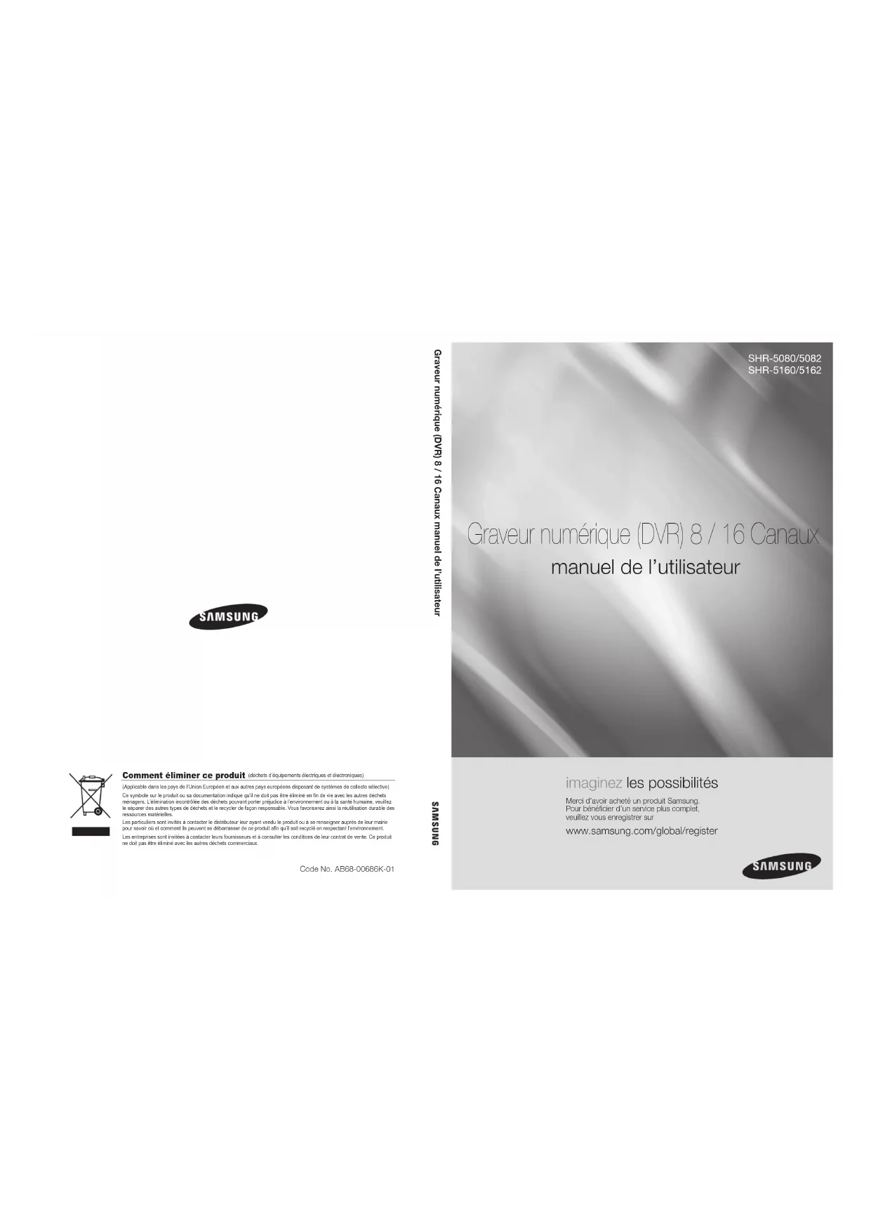 Graveur numérique (DVR) 8 / 16 Canaux manuel de l’utilisateur Merci d’avoir acheté un produit Samsung. Pour bénéficier d’un service plus complet, veuillez vous enregistrer sur www.samsung.com/global/register imaginez les possibilités SHR-5080/5082 SHR-5160/5162 Graveur numérique (DVR) 8 / 16 Canaux manuel de l’utilisateur Comment éliminer ce produit (déchets d’équipements électriques et électroniques)(Applicable dans les pays de l’Union Européen et aux autres pays européens disposant de systémes de collecte sélective) Ce symbole sur le produit ou sa documentation indique qu’il ne doit pas être éliminé en fin de vie avec les autres déchets ménagers. L’élimination incontrôlée des déchets pouvant porter préjudice à l’environnement ou à la santé humaine, veuillez le séparer des autres types de déchets et le recycler de façon responsable. Vous favoriserez ainsi la réutilisation durable des ressources matérielles. Les particuliers sont invités à contacter le distributeur leur ayant vendu le produit ou à se renseigner auprès de leur mairie pour savoir où et comment ils peuvent se débarrasser de ce produit afin qu’il soit recyclé en respectant l’environnement. Les entreprises sont invitées à contacter leurs fournisseurs et à consulter les conditions de leur contrat de vente. Ce produit ne doit pas être éliminé avec les autres déchets commerciaux.Code No. AB68-00686K-01 SHR-5162_FRA.indb 1 2007-8-2 13:47:52caractéristiques principales de votre DVR Le graveur numérique (DVR) compresse les images reçues de 8/16 canaux vidéo des caméras utilisant la technologie MPEG-4, compresse les entrées audio de 4 canaux en fichier audio ADPCM pour les enregistrer sur disque dur ou les récupérer du disque dur. Il transfère en outre les données audio et vidéo par un réseau et vous permet de les contrôler à distance à l’aide de votre PC.