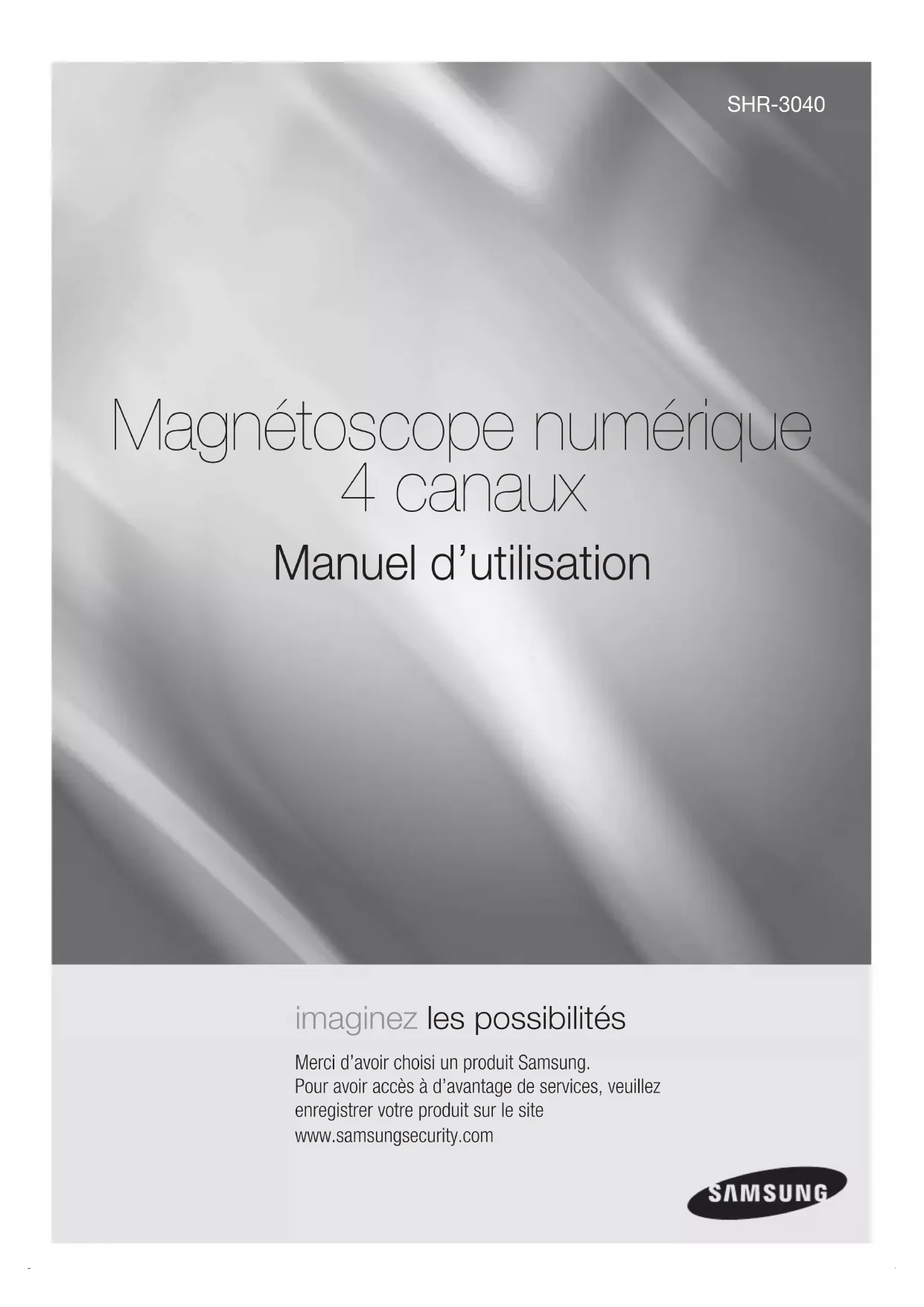 Magnétoscope numérique 4 canaux SHR-3040 Manuel d’utilisation imaginez les possibilités Merci d’avoir choisi un produit Samsung. Pour avoir accès à d’avantage de services, veuillez enregistrer votre produit sur le site www.samsungsecurity.com2_ présentation présentation FONCTIONS PRINCIPALES Affi chage Affi chage en temps réel de chaque canal Affi chage en mode Séquence auto pour les 4 canaux PIP (Incrustation d’image) Mode Pause ZOOM 2X Basculement rapide entre l’écran Live et l’écran de lecture Prise en charge de la caméra PTZ Enregistrement Jusqu’à 3 niveaux différents de qualité et de vitesse d’image Enregistrement audio Enregistrement programmé Enregistrement d’événement via les capteurs externes et la détection de mouvement Enregistrement d’urgence Réseau Surveillance à distance via Web Viewer Prise en charge du service DDNS Lecture Recherche par taille de données et par date/heure Réglage de la vitesse de lecture en avant/arrière Recherche par événement Stockage des données Sauvegarde simple et facile sur mémoire USB Sauvegarde réseau Divers Prise en charge UNICODE Écran de sortie principale Détection de perte vidéo