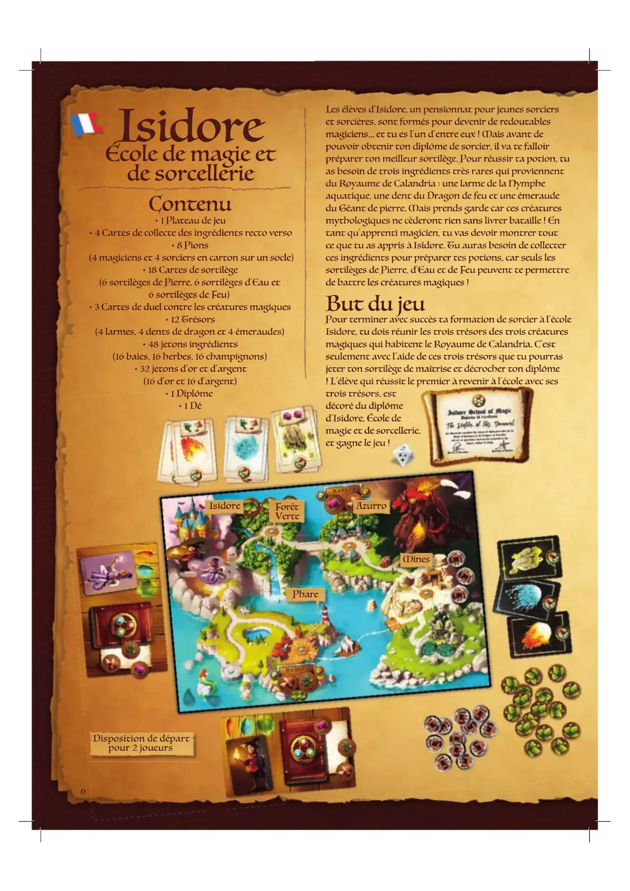 - 1 Dé Les élèves d’Isidore, un pensionnat pour jeunes sorciers et sorcières, sont formés pour devenir de redoutables magiciens… et tu es l’un d’entre eux ! Mais avant de pouvoir obtenir ton diplôme de sorcier, il va te falloir préparer ton meilleur sortilège. Pour réussir ta potion, tu as besoin de trois ingrédients très rares qui proviennent du Royaume de Calandria : une larme de la Nymphe aquatique, une dent du Dragon de feu et une émeraude du Géant de pierre. Mais prends garde car ces créatures mythologiques ne cèderont rien sans livrer bataille ! En tant qu’apprenti magicien, tu vas devoir montrer tout ce que tu as appris à Isidore. Tu auras besoin de collecter ces ingrédients pour préparer tes potions, car seuls les sortilèges de Pierre, d’Eau et de Feu peuvent te permettre de battre les créatures magiques ! But du jeu Pour terminer avec succès ta formation de sorcier à l’école Isidore, tu dois réunir les trois trésors des trois créatures magiques qui habitent le Royaume de Calandria. C’est seulement avec l’aide de ces trois trésors que tu pourras jeter ton sortilège de maîtrise et décrocher ton diplôme ! L’élève qui réussit le premier à revenir à l’école avec ses trois trésors, est décoré du diplôme d’Isidore, École de magie et de sorcellerie, et gagne le jeu ! 6Avant de commencer