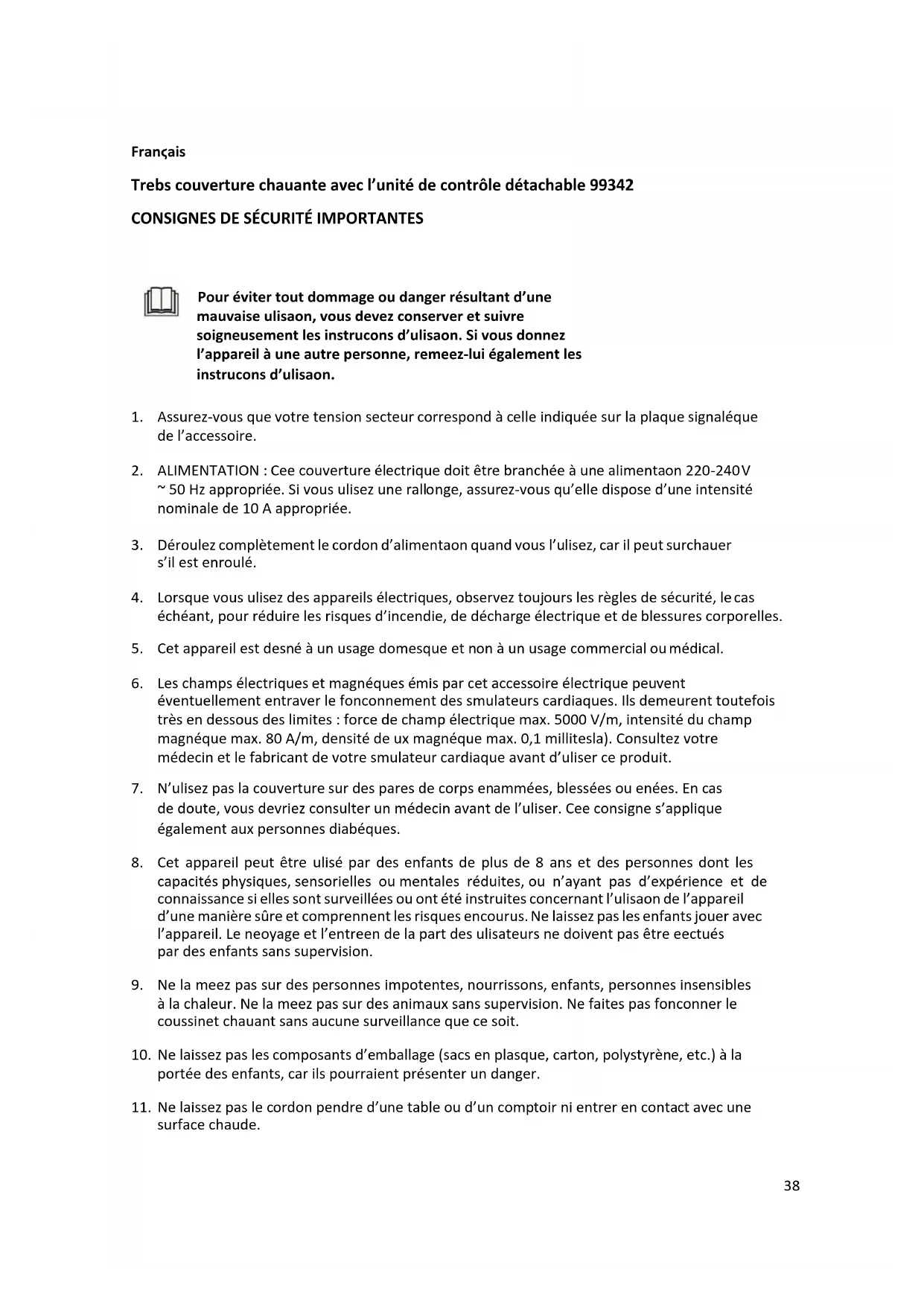 Consignes de sécurité spéciales : – elle doit être branchée à une alimentation 220-240 V ~ 50 Hz appropriée – ne l’allumez pas et ne l’utilisez pas quand elle est pliée ou froissée. – ne la bordez pas ou ne la fixez pas (particulièrement si vous utilisez des matelas séparés ou des canapés rabattables. – ne la pliez pas brusquement – ne l’utilisez pas avec des animaux – ne l’utilisez pas si elle est mouillée ou humide – ne l’utilisez pas si elle a des plis, évitez de la froisser, n’insérez pas d’épingles dans la couverture électrique, ne l’utilisez pas si elle est humide ou a été éclaboussée. – lorsque la couverture chauffante est allumée, il ne doit pas y avoir d’objets (par exemple, une valise ou un panier à linge), d’éléments chauffants tels que des bouteilles d’eau chaude ou des coussins chauffants dessus – l’interrupteur ne doit pas être couvert de couvertures, oreillers, etc., et ne doit pas être posé dessus – ne tirez pas sur le cordon, ne le retournez pas ou ne le pliez pas brusquement – L’accessoire ne doit pas être utilisé par de jeunes enfants âgés de plus de trois ans, à moins qu’un parent ou un tuteur n’ait préréglé les commandes, ou à moins qu’ils n’aient reçu des instructions adéquates sur la manière de les utiliser en toute sécurité. Les enfants de moins de trois ans ne doivent pas utiliser cet accessoire en raison de leur incapacité à réagir en cas de surchauffe. – Il faut régulièrement vérifier l’accessoire pour détecter les signes d’usure ou de dommage.