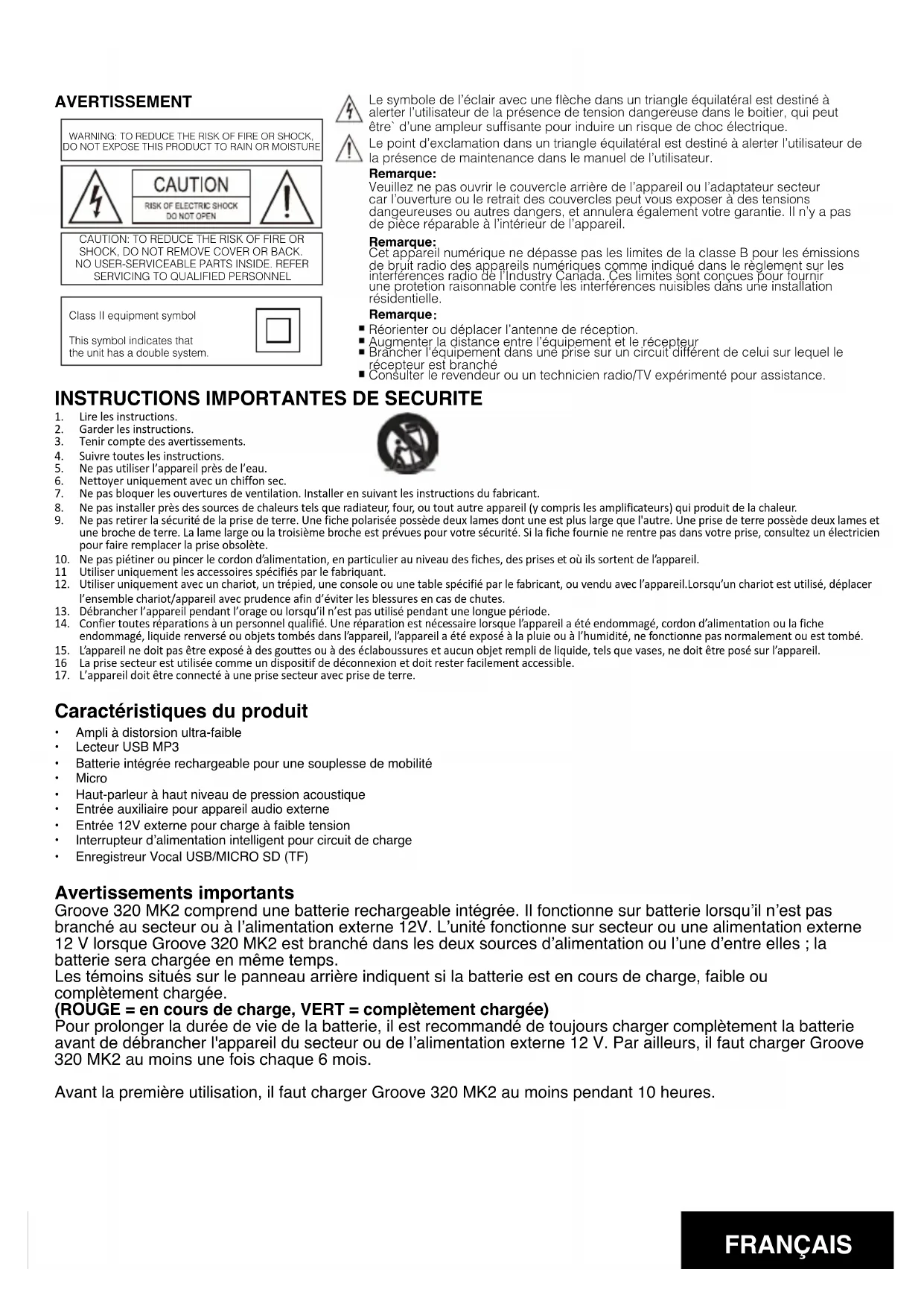 Avant la première utilisation, il faut charger Groove 320 MK2 au moins pendant 10 heures.
