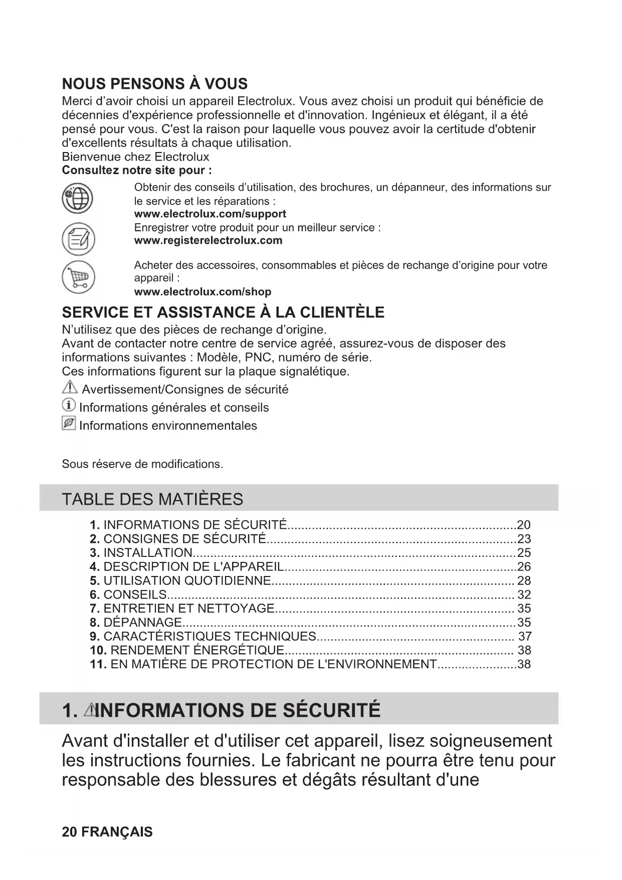 Merci d’avoir choisi un appareil Electrolux. Vous avez choisi un produit qui bénéficie dedécennies d'expérience professionnelle et d'innovation. Ingénieux et élégant, il a étépensé pour vous. C'est la raison pour laquelle vous pouvez avoir la certitude d'obtenird'excellents résultats à chaque utilisation.Bienvenue chez ElectroluxConsultez notre site pour :Obtenir des conseils d’utilisation, des brochures, un dépanneur, des informations surle service et les réparations :www.electrolux.com/supportEnregistrer votre produit pour un meilleur service :www.registerelectrolux.comAcheter des accessoires, consommables et pièces de rechange d’origine pour votreappareil :www.electrolux.com/shop