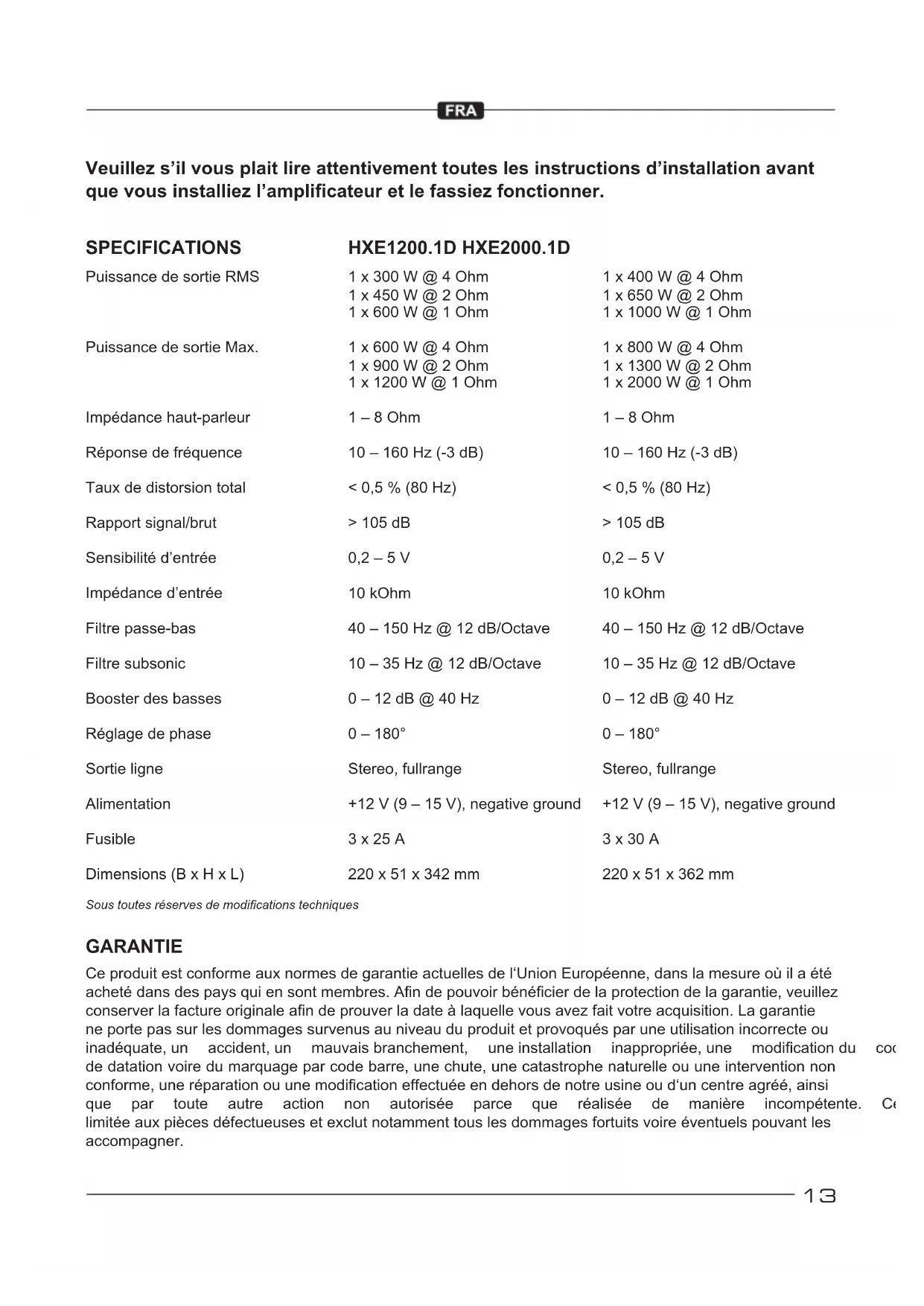 5. Have alternator and battery load tested by your mechanic.Verify good working order of vehicle electrical system including distributor, spark plugs, spark plug wires, voltage regulator etc.13 Veuillez s’il vous plait lire attentivement toutes les instructions d’installation avant que vous installiez l’amplicateur et le fassiez fonctionner. Sous toutes réserves de modications techniques GARANTIE Ceproduitestconformeauxnormesdegarantieactuellesdel‘UnionEuropéenne,danslamesureoùilaété achetédansdespaysquiensontmembres.Andepouvoirbénécierdelaprotectiondelagarantie,veuillez conserverlafactureoriginaleandeprouverladateàlaquellevousavezfaitvotreacquisition.Lagarantie neportepassurlesdommagessurvenusauniveauduproduitetprovoquésparuneutilisationincorrecteou inadéquate,un accident,un mauvaisbranchement, uneinstallation inappropriée,une modicationdu code de datation voire du marquage par code barre, une chute, une catastrophe naturelle ou une intervention non conforme,uneréparationouunemodicationeffectuéeendehorsdenotreusineoud‘uncentreagréé,ainsi que par toute autre action non autorisée parce que réalisée de manière incompétente. Cette garantie est limitéeauxpiècesdéfectueusesetexclutnotammenttouslesdommagesfortuitsvoireéventuelspouvantles accompagner. SPECIFICATIONS Puissance de sortie RMS Puissance de sortie Max. Impédancehaut-parleur Réponsedefréquence Taux de distorsion total Rapport signal/brut Sensibilitéd’entrée Impédanced’entrée Filtre passe-bas Filtre subsonic Booster des basses Réglagedephase Sortie ligne Alimentation Fusible Dimensions (B x H x L) 1 x 300 W @ 4 Ohm 1 x 450 W @ 2 Ohm 1 x 600 W @ 1 Ohm 1 x 600 W @ 4 Ohm 1 x 900 W @ 2 Ohm 1 x 1200 W @ 1 Ohm 1 – 8 Ohm 10 – 160 Hz (-3 dB) < 0,5 % (80 Hz) > 105 dB 0,2 – 5 V 10 kOhm 40 – 150 Hz @ 12 dB/Octave 10 – 35 Hz @ 12 dB/Octave 0 – 12 dB @ 40 Hz 0 – 180° Stereo, fullrange +12 V (9 – 15 V), negative ground 3 x 25 A 220 x 51 x 342 mm 1 x 400 W @ 4 Ohm 1 x 650 W @ 2 Ohm 1 x 1000 W @ 1 Ohm 1 x 800 W @ 4 Ohm 1 x 1300 W @ 2 Ohm 1 x 2000 W @ 1 Ohm 1 – 8 Ohm 10 – 160 Hz (-3 dB) < 0,5 % (80 Hz) > 105 dB 0,2 – 5 V 10 kOhm 40 – 150 Hz @ 12 dB/Octave 10 – 35 Hz @ 12 dB/Octave 0 – 12 dB @ 40 Hz 0 – 180° Stereo, fullrange +12 V (9 – 15 V), negative ground 3 x 30 A 220 x 51 x 362 mm