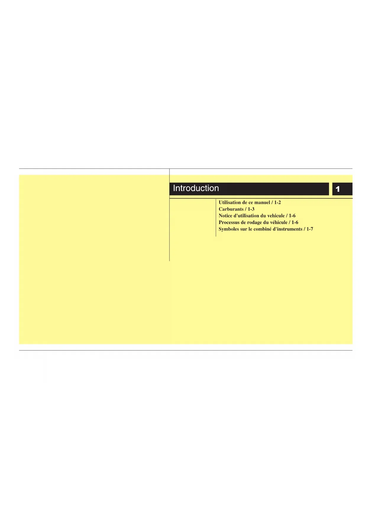 Utilisation de ce manuel / 1-2 Carburants / 1-3 Notice d'utilisation du vehicule / 1-6 Processus de rodage du véhicule / 1-6 Symboles sur le combiné d'instruments / 1-7 IntroductionIntroduction