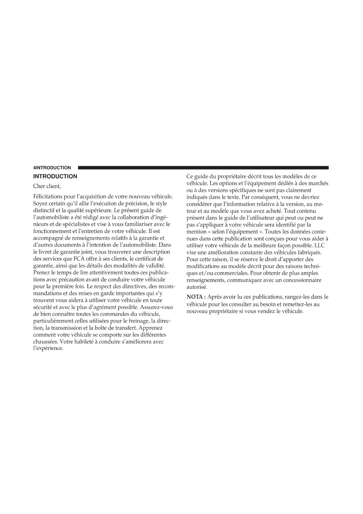 Felicitations pour l'acquisition de votre nouveau vehicule. Soyez certain qu'il allie l'execution de précision, le style distinctif et la qualite supérieure. Le present guide de l'automobiliste a ete redigede avec la collaboration d'ingénieurs et de specialistes et visa a vous familiariser avec le fonctionnement et I'entretien de Your vehicule. Il est accompagne de renseignements relatifs a la garantie et d'autres documents a I'intention de I'automobiliste.Dans le livret de garantie joint, you trouvez une description des services que FCA offre a ses clients, le certificat de garantie, ainsi que les details des modalités de validite. Prenez le temps de dire attentivement toutes ces publications avec precaution avant de conduire Your vehicule pour la premiere fois. Le respect des directives, des recom-mandations et des mises en garde importantes qui s'y trouvent you aidera a utiliser Your vehicule en toute sécurité et avec le plus d'agrement possible. Assurez-vous de bien connaître toutes les commandes du vehicule, particulierement celles utilisées pour le freinage, la direction, la transmission et la boite de transfert. Apprenez comment votre vehicule se comporte sur les différentes chaussees.Votre habileté a conduire s'améliorera avec I'expérience.