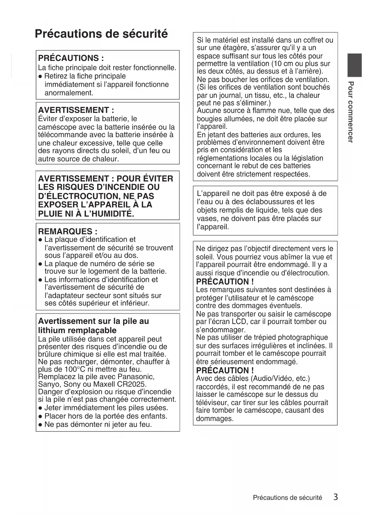 L’appareil ne doit pas être exposé à de l’eau ou à des éclaboussures et les objets remplis de liquide, tels que des vases, ne doivent pas être placés sur l’appareil.Si le matériel est installé dans un coffret ou sur une étagère, s’assurer qu’il y a un espace suffisant sur tous les côtés pour permettre la ventilation (10 cm ou plus sur les deux côtés, au dessus et à l’arrière).Ne pas boucher les orifices de ventilation.(Si les orifices de ventilation sont bouchés par un journal, un tissu, etc., la chaleur peut ne pas s’éliminer.) Aucune source à flamme nue, telle que des bougies allumées, ne doit être placée sur l’appareil.En jetant des batteries aux ordures, les problèmes d’environnement doivent être pris en considération et les réglementations locales ou la législation concernant le rebut de ces batteries doivent être strictement respectées.Ne dirigez pas l’objectif directement vers le soleil. Vous pourriez vous abîmer la vue et l’appareil pourrait être endommagé. Il y a aussi risque d’incendie ou d’électrocution. PRÉCAUTION ! Les remarques suivantes sont destinées à protéger l’utilisateur et le caméscope contre des dommages éventuels. Ne pas transporter ou saisir le caméscope par l’écran LCD, car il pourrait tomber ou s’endommager. Ne pas utiliser de trépied photographique sur des surfaces irrégulières et inclinées. Il pourrait tomber et le caméscope pourrait être sérieusement endommagé. PRÉCAUTION ! Avec des câbles (Audio/Vidéo, etc.) raccordés, il est recommandé de ne pas laisser le caméscope sur le dessus du téléviseur, car tirer sur les câbles pourrait faire tomber le caméscope, causant des dommages. Précautions de sécurité Pour commencer. PRÉCAUTIONS : Pour éviter tout risque d’électrocution, ne pas ouvrir le boîtier. Aucune pièce intérieure n’est à régler par l’utilisateur. Se référer à un agent qualifié en cas de problème. Si l’on ne se sert pas de l’adaptateur secteur pendant une longue période, il est recommandé de débrancher le cordon d’alimentation de la prise secteur.