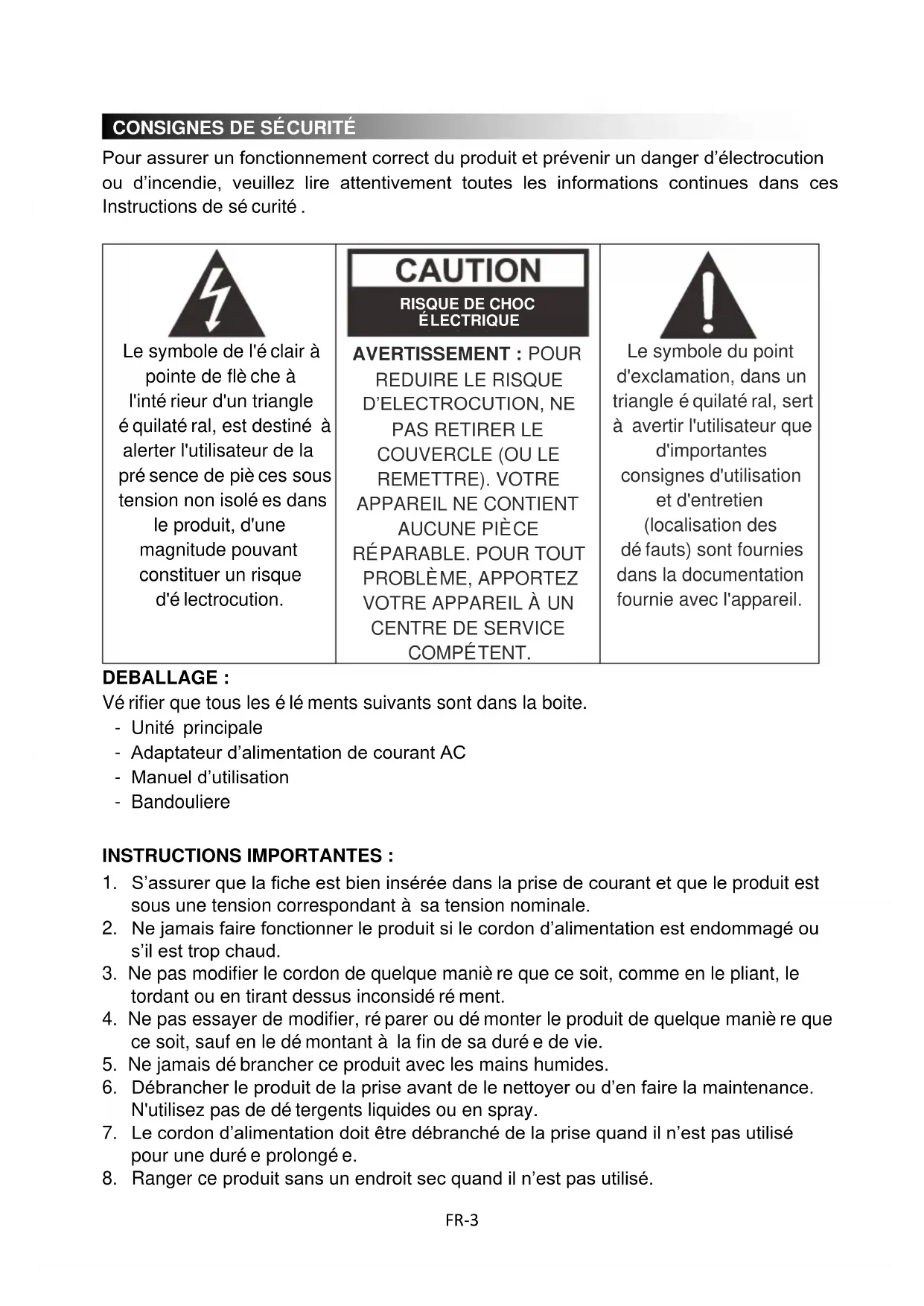Pour assurer un fonctionnement correct du produit et prévenir un danger d'électrocution ou d'incendie, veuillez lire attentivement toutes les informations continues dans ces Instructions de sécurité.