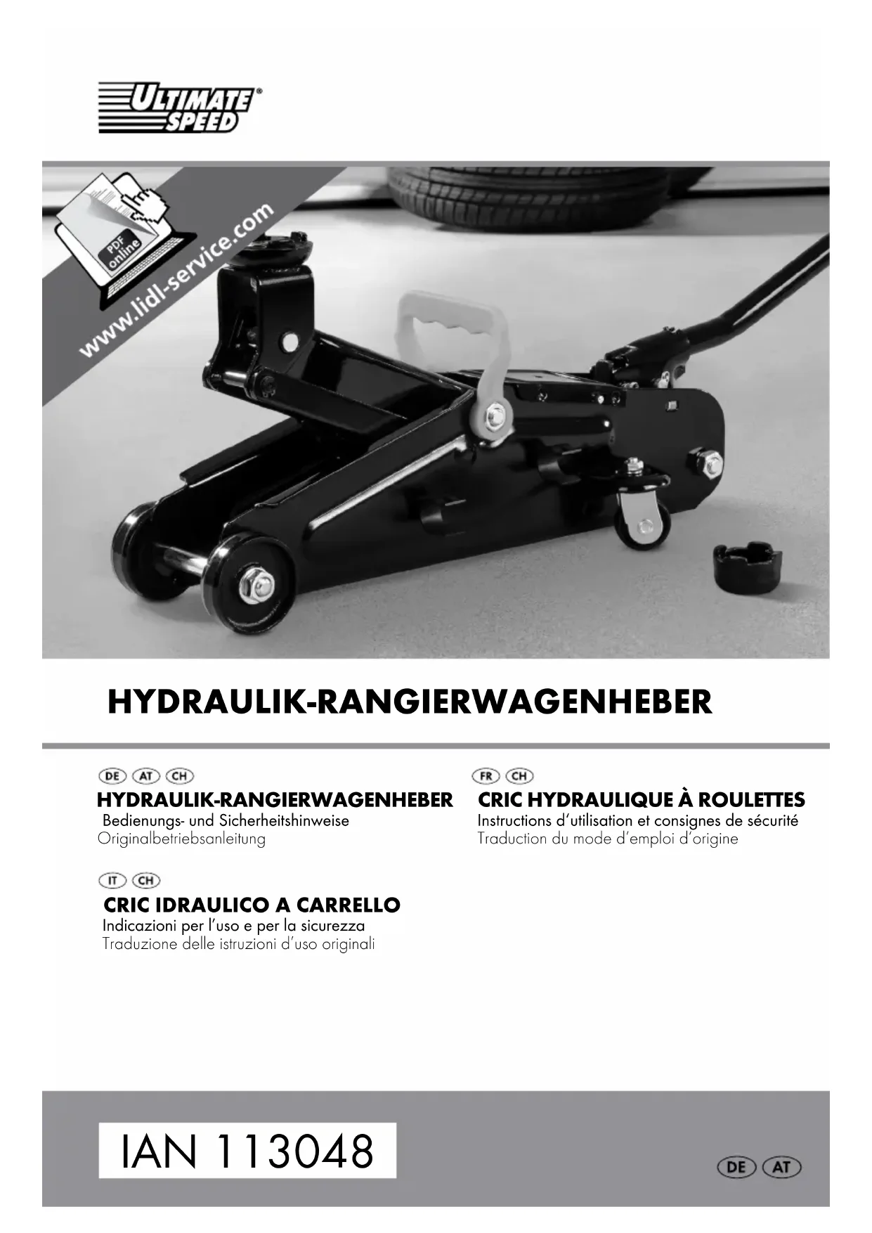 Schalter, Akkus oder die aus Glas gefertigt sind.10 FR/CH Cric hydraulique à roulettes Utilisation conforme Le cric hydraulique est destiné à lever et abais- ser des véhicules. Toutes utilisations autres ou modifications du cric hydraulique sont considé- rées comme non conformes à l’usage prévu et impliquent des risques de blessures et de dom- mages matériels. Le fabricant décline toute res- ponsabilité pour les dégâts résultant d’une utilisation non conforme. Ce produit n’est pas conçu pour une utilisation commerciale. Remarque : Après chaque utilisation, fermer la soupape d’abaissement