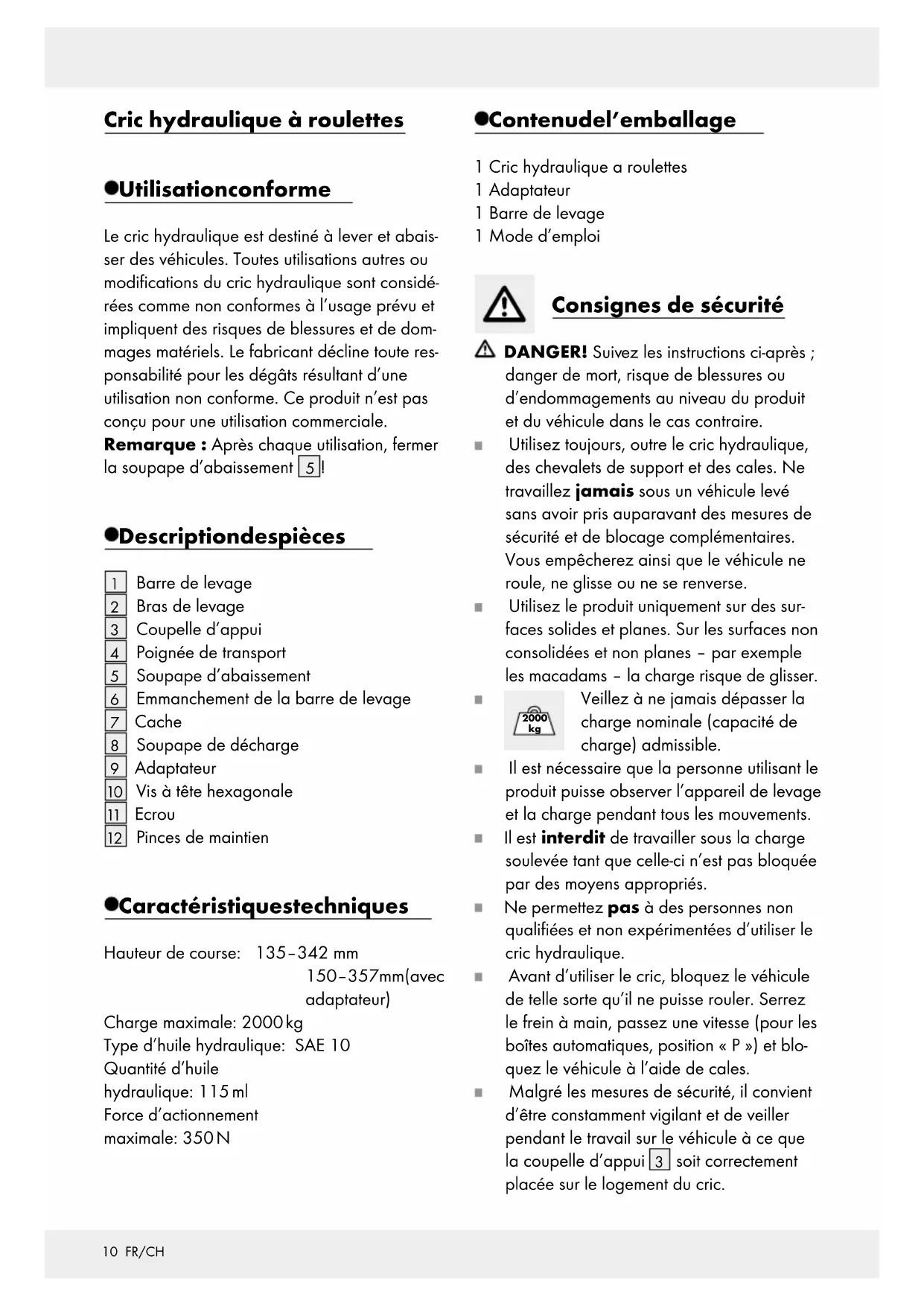 Pinces de maintien Caractéristiques techniques Hauteur de course: 135–342 mm 150–357 mm (avec adaptateur) Charge maximale: 2000 kg Type d’huile hydraulique: SAE 10 Quantité d’huile hydraulique: 115 ml Force d’actionnement maximale: 350 N Contenu de l’emballage 1 Cric hydraulique a roulettes 1 Adaptateur 1 Barre de levage 1 Mode d’emploi Consignes de sécurité DANGER! Suivez les instructions ci-après; danger de mort, risque de blessures ou d’endommagements au niveau du produit et du véhicule dans le cas contraire. Utilisez toujours, outre le cric hydraulique, des chevalets de support et des cales. Ne travaillez jamais sous un véhicule levé sans avoir pris auparavant des mesures de sécurité et de blocage complémentaires. Vous empêcherez ainsi que le véhicule ne roule, ne glisse ou ne se renverse. Utilisez le produit uniquement sur des sur- faces solides et planes. Sur les surfaces non consolidées et non planes – par exemple les macadams – la charge risque de glisser.