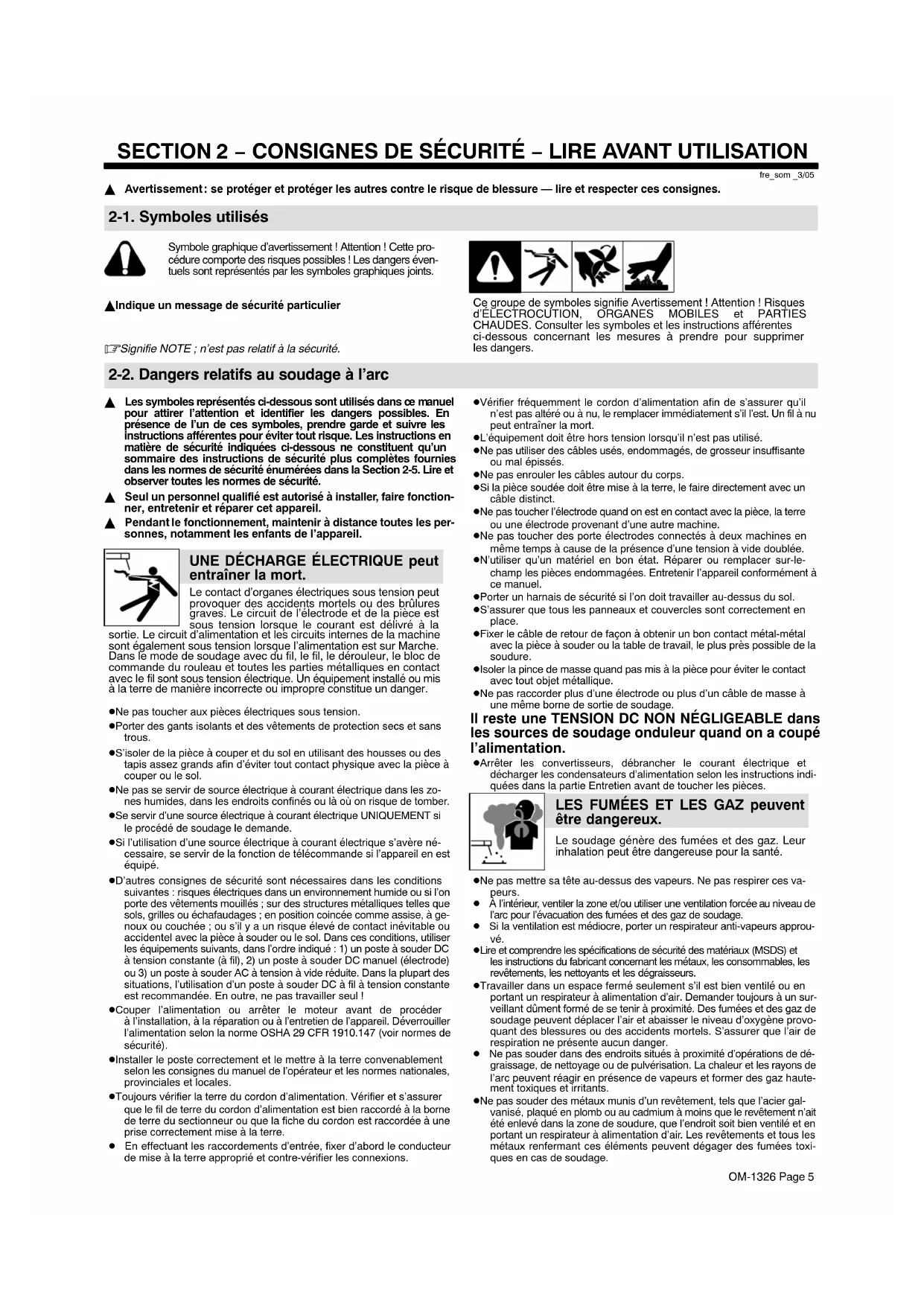 Lire et comprendre les specifications de sécurité des matériaux (MSDS) et les instructions du fabricant concernant les métaux, les consommables, les revêtements, les nettoyants et les dégraiscents. - Travailler dans un espace fermé seulement s'il est bien ventilé ou en portant un respirateur à alimentation d'air. Demander souvent à un survillant dûment formé de se tenir à proximite. Des fumees et des gaz de soudage peuvent déplacer l'air et abaisser le niveau d'oxygène provoquant des blessures ou des accidents mortels. S'assurer que l'air de respiration ne présente aucun danger.