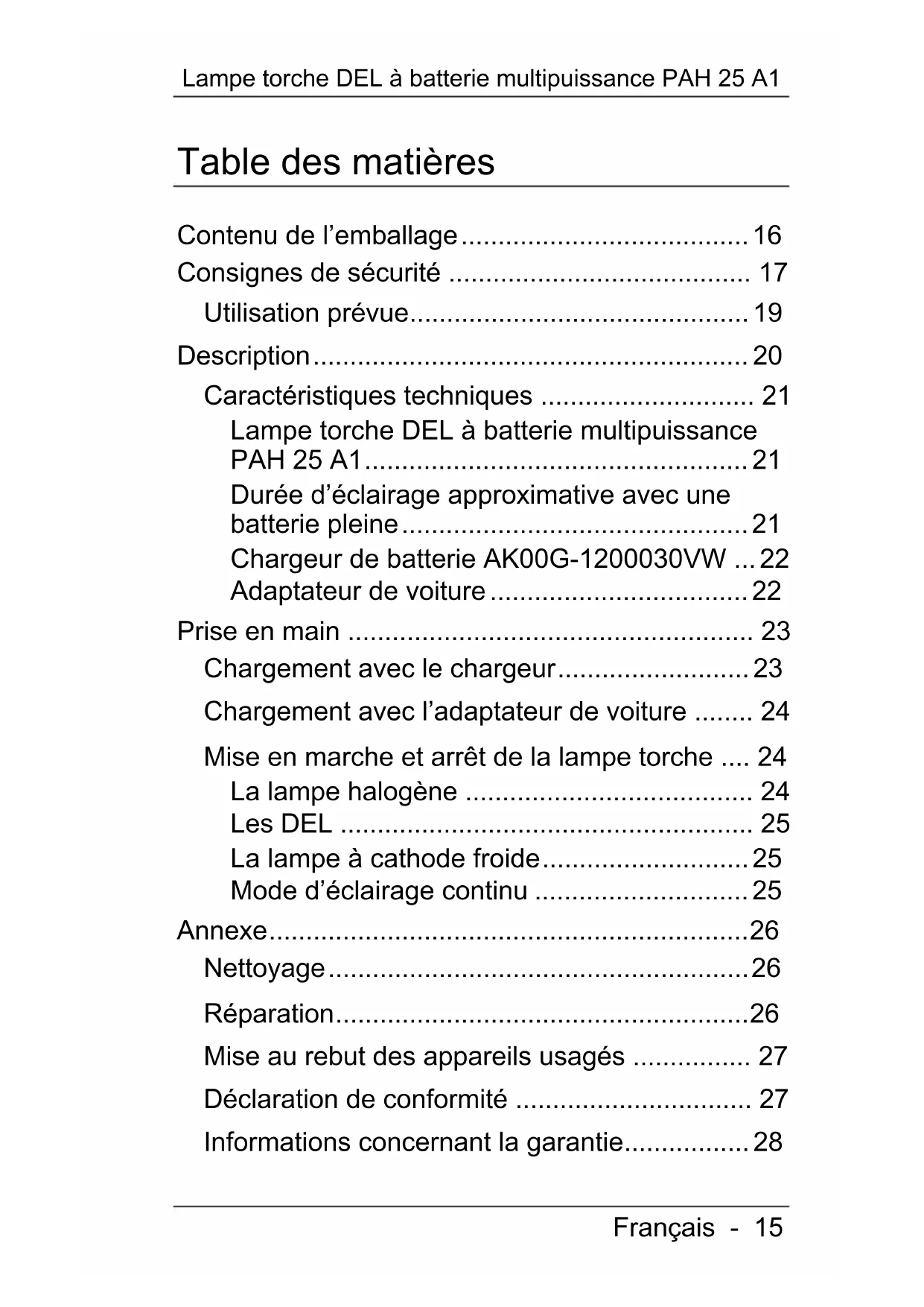 La lampe torché DEL à batterie multipuisance PAH 25 A1, appelée ci-après la « lampe torché », contient une batterie rechargeable intégrée. Au besoin, vous pouvez recharger la batterie intégrée avec le chargeur AK00G-1200030VW ou l'adaptateur de voiture fournis.