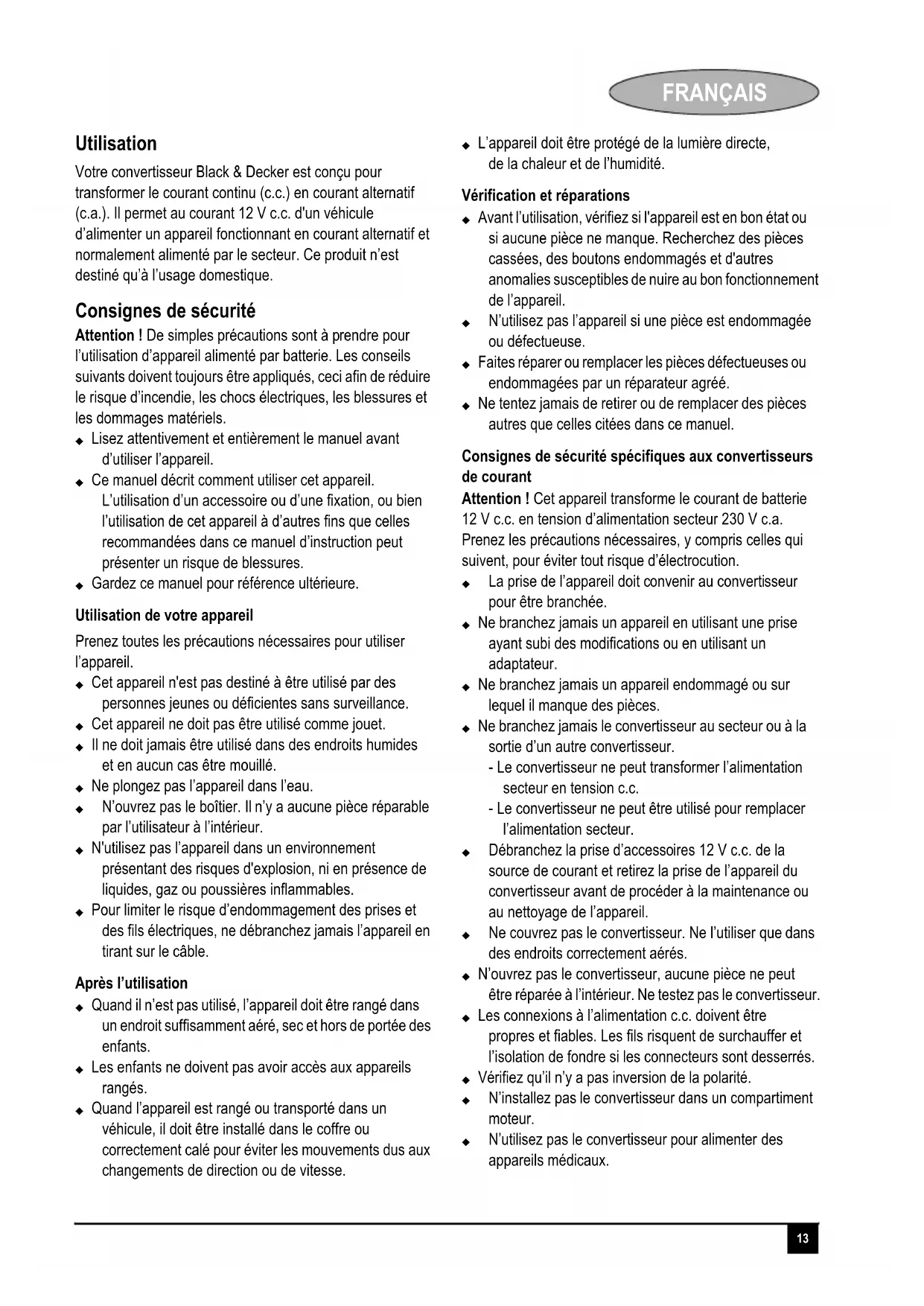 Votre convertisseur Black & Decker est conçu pour transformer le courant continu (c. c.) en courant alternatif (c. a.). Il permet au courant 12 V c. c. d'un véhicule d'alimenter un appareil fonctionnant en courant alternatif et normalement alimenté par le secteur. Ce produit n'est destiné qu'à l'usage domestique.