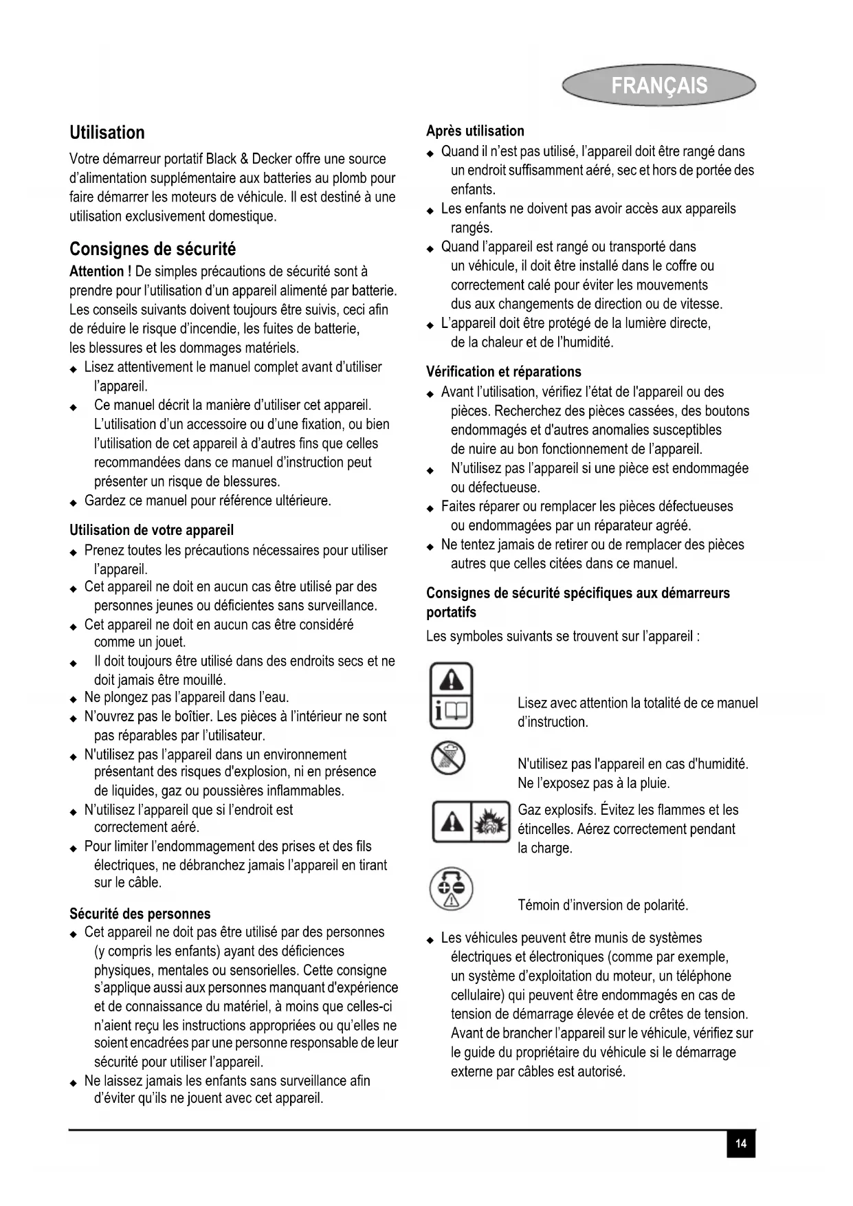 Votre démarreur portatif Black & Decker offre une source d'alimentation supplémentaire aux batteries au plomb pour faire démarrer les moteurs de vehicule. Il est destiné à une utilisation exclusivement domestique.