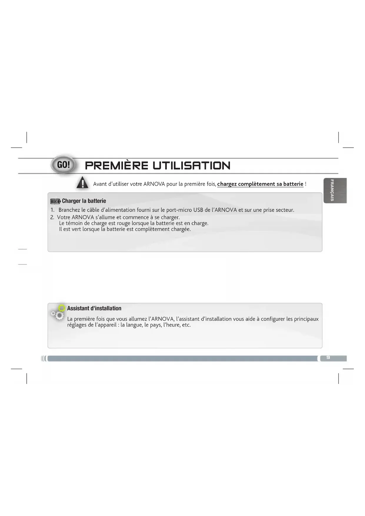 Assistant d’installation La première fois que vous allumez l’ARNOVA, l’assistant d’installation vous aide à configurer les principaux réglages de l’appareil : la langue, le pays, l’heure, etc. Avant d’utiliser votre ARNOVA pour la première fois, chargez complètement sa batterie !