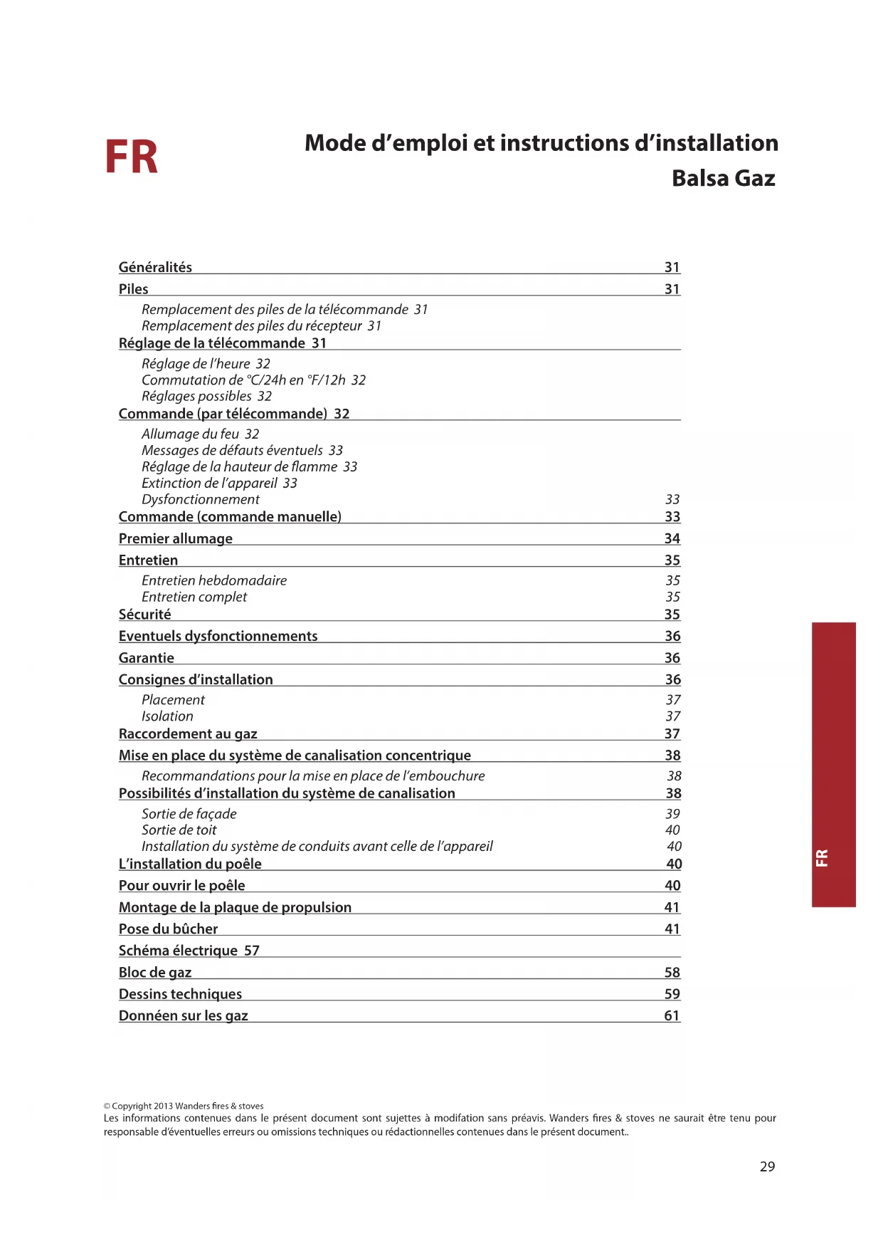 Mode d’emploi et instructions d’installation Balsa Gaz © Copyright 2013 Wanders res & stoves Les informations contenues dans le présent document sont sujettes à modifation sans préavis. Wanders res & stoves ne saurait être tenu pour responsable d’éventuelles erreurs ou omissions techniques ou rédactionnelles contenues dans le présent document.. Généralités 31 Piles 31 Remplacement des piles de la télécommande 31 Remplacement des piles du récepteur 31 Réglage de la télécommande 31 Réglage de l’heure 32 Commutation de °C/24h en °F/12h 32 Réglages possibles 32 Commande (par télécommande) 32 Allumage du feu 32 Messages de défauts éventuels 33 Réglage de la hauteur de amme 33 Extinction de l’appareil 33 Dysfonctionnement 33 Commande (commande manuelle) 33 Premier allumage 34 Entretien 35 Entretien hebdomadaire 35 Entretien complet 35 Sécurité 35 Eventuels dysfonctionnements 36 Garantie 36 Consignes d’installation 36 Placement 37 Isolation 37 Raccordement au gaz 37 Mise en place du système de canalisation concentrique 38 Recommandations pour la mise en place de l’embouchure 38 Possibilités d’installation du système de canalisation 38 Sortie de façade 39 Sortie de toit 40 Installation du système de conduits avant celle de l’appareil 40 L’installation du poêle 40 Pour ouvrir le poêle 40 Montage de la plaque de propulsion 41 Pose du bûcher 41 Schéma électrique 57 Bloc de gaz 58 Dessins techniques 59 Donnéen sur les gaz 6130