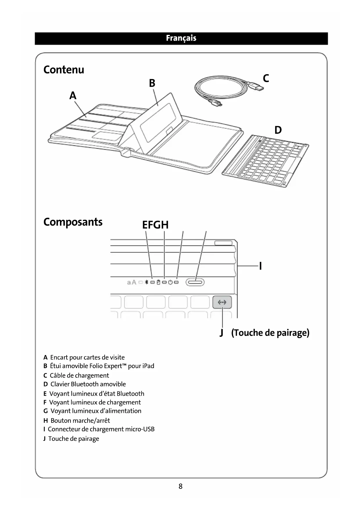 A Encart pour cartes de visite B Etui amovable Folio Expert™ pour iPad C Cable de chargement D Clavier Bluetooth amovable E Voyant lumineux d'état Bluetooth F Voyant lumineux de chargement G Voyant lumineux d'alimentation H Bouton marche/arrêt