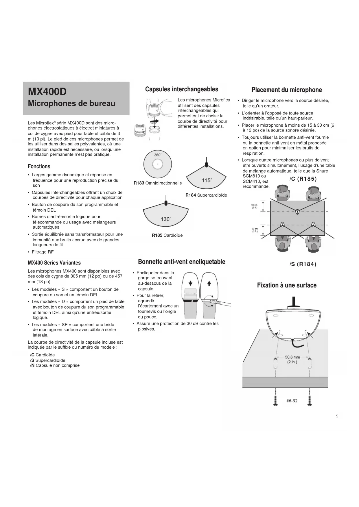 série MX400D sont des micro- phones électrostatiques à électret miniatures à col de cygne avec pied pour table et câble de 3 m (10 pi). Le pied de ces microphones permet de les utiliser dans des salles polyvalentes, où une installation rapide est nécessaire, ou lorsqu’une installation permanente n’est pas pratique. Fonctions