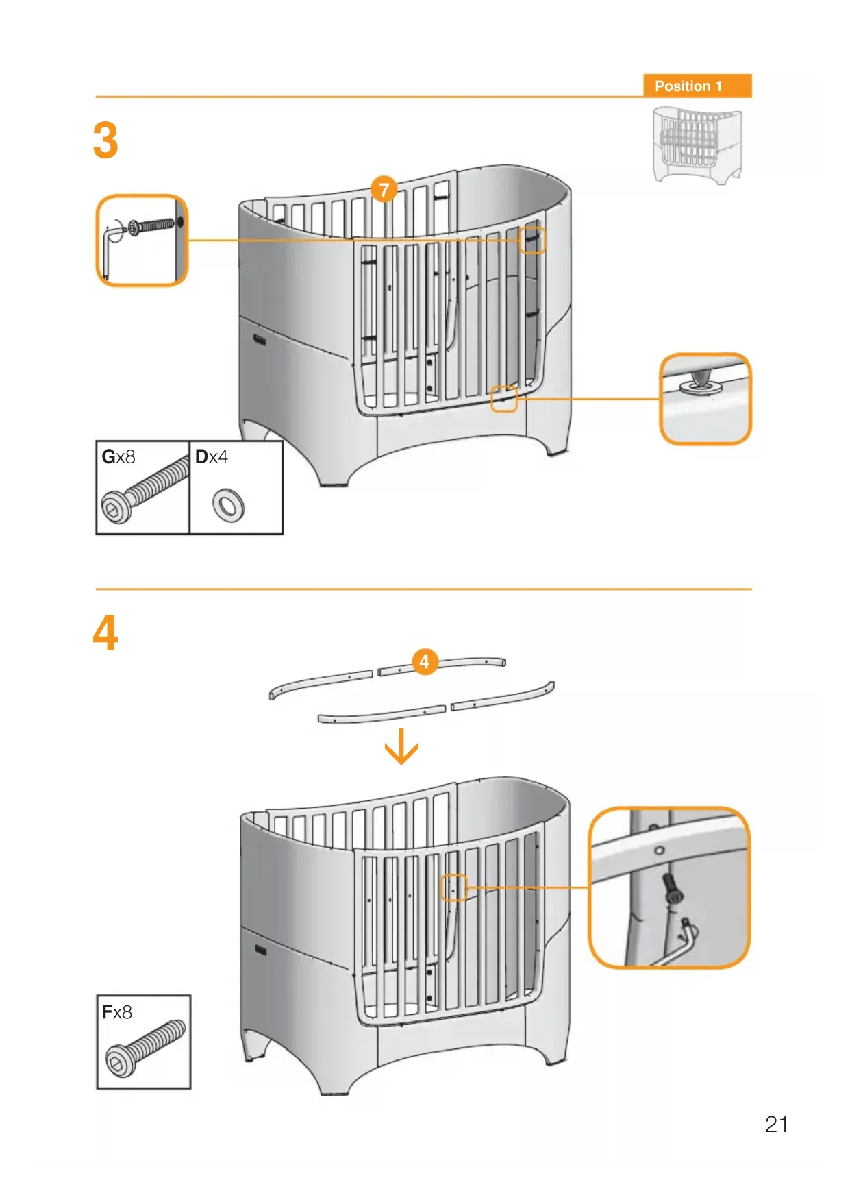 Pos. 1 La position du fond du lit peut etre ajustee a deux hauteurs diff erentes. Assurez-vous que la distance entre le matelas et le bord supieur du cadre ne soit jamais inférieure a 300~mm en position haute et 500~mm en position basse. L'epaisseur maximum du matelas est indiquee par une marque sur les sections a barreaux du lit. En utilisant le matelas original Leander, youes etes sur que la distance par rapport au bord supieur est correcte. Le plus sur est always de placer le fond du lit a sa position inférieure.