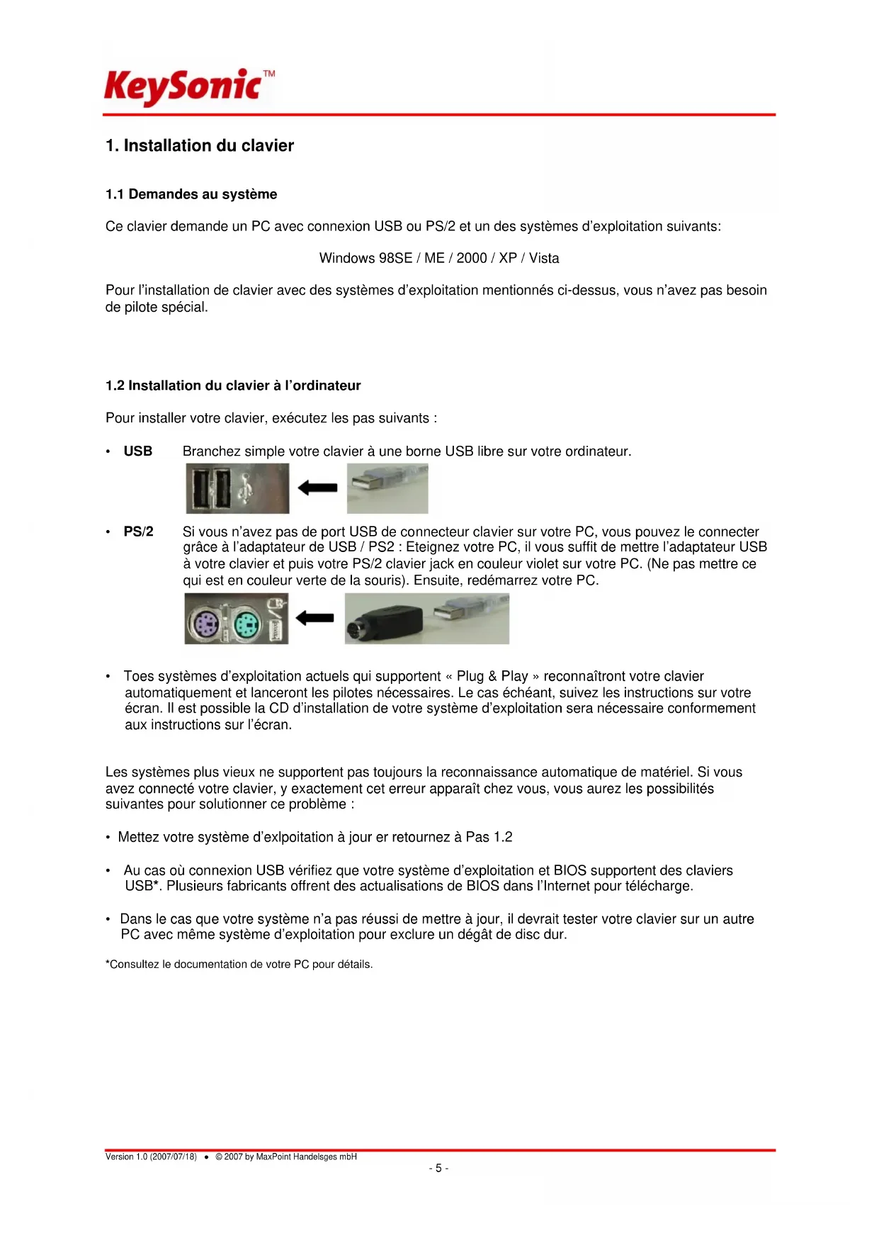 Au cas ou connexion USB vérifie que votre système d'exploitation et BIOS supportent des claviers USB*. Plusieurs fabricants offrent des actualisations de BIOS dans l'Internet pour télécharge.