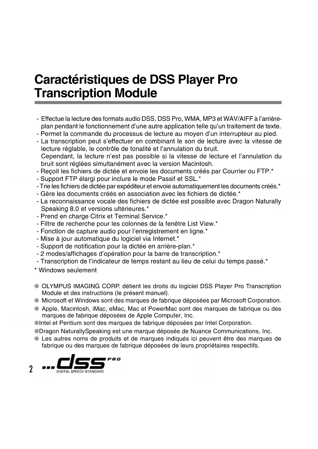 - Windows seulement ● OLYMPUS IMAGING CORP. détient les droits du logiciel DSS Player Pro Transcription Module et des instructions (le présent manuel). ● Microsoft et Windows sont des marques de fabrique déposées par Microsoft Corporation. ● Apple, Macintosh, iMac, eMac, Mac et PowerMac sont des marques de fabrique ou des marques de fabrique déposées de Apple Computer, Inc. ● Intel et Pentium sont des marques de fabrique déposées par Intel Corporation. ● Dragon NaturallySpeaking est une marque déposée de Nuance Communications, Inc. ● Les autres noms de produits et de marques indiqués ici peuvent être des marques de fabrique ou des marques de fabrique déposées de leurs propriétaires respectifs.3 Table des matières Préparation Introduction Commençons Support pour l’ utilisateur Configuration minimale......................... 4 Installation du logiciel DSS Player ....... 5 Désinstaller un logiciel DSS Player ...... 6 Utiliser l’aide en ligne ........................... 7 Mise en marche du logiciel DSS Player...