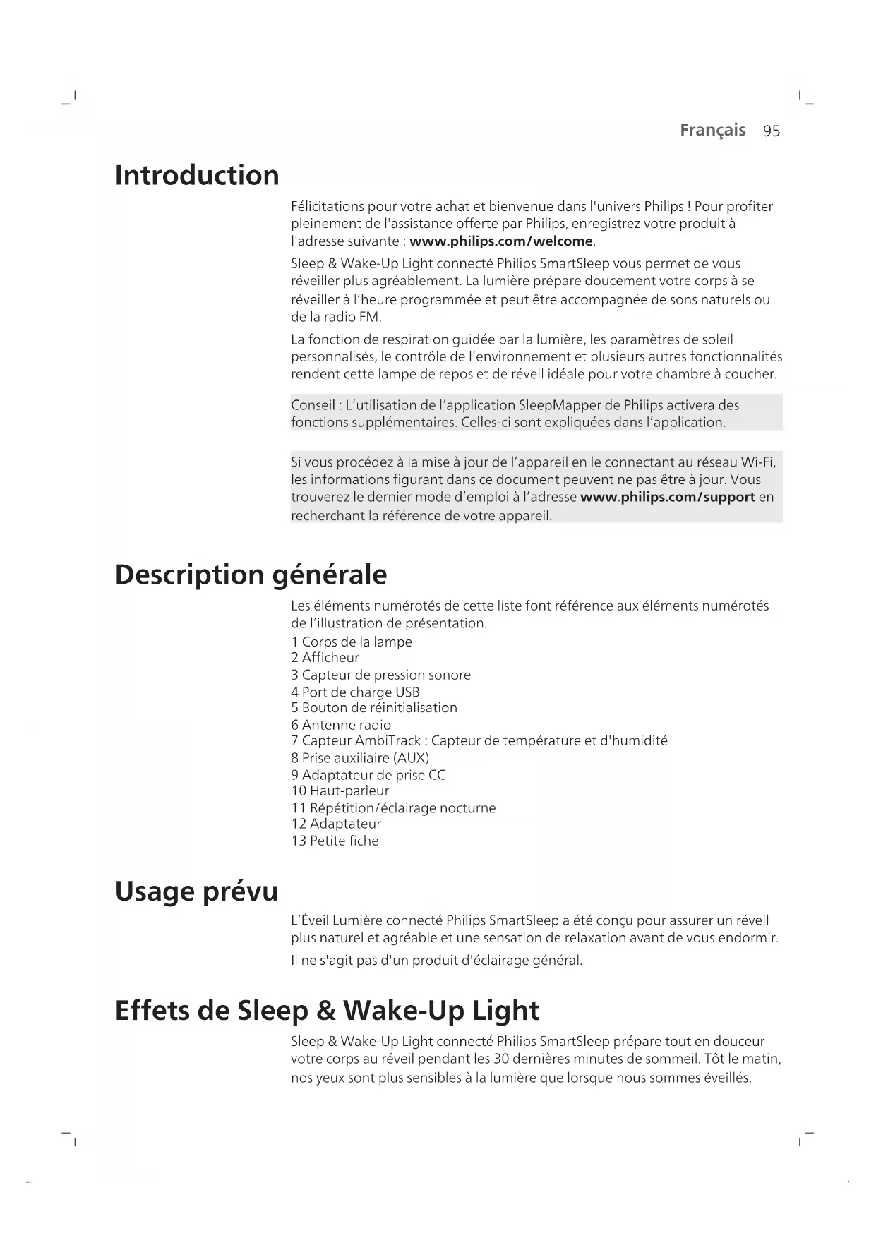 Français Sommaire Introduction _____________________________________________________________________________ 95 Description générale_______________________________________________________________________ 95 Usage prévu ______________________________________________________________________________ 95 Effets de Sleep & Wake-Up Light ____________________________________________________________ 95 Informations de sécurité importantes ________________________________________________________ 96 Sécurité et conformité _____________________________________________________________________ 98 Champs électromagnétiques (CEM)__________________________________________________________ 98 Icônes du menu interactif __________________________________________________________________ 98 Connexion Wi-Fi de votre appareil___________________________________________________________ 99 Navigation dans le menu ___________________________________________________________________ 100 Réglage des profils de réveil ________________________________________________________________ 101 L'heure + alarme de secours ________________________________________________________________ 102 Répétition ________________________________________________________________________________ 103 Ignorer l’alarme ___________________________________________________________________________ 103 Utilisation de l’appareil comme lampe de chevet ______________________________________________ 103 Éclairage nocturne ________________________________________________________________________ 104 Paramètres _______________________________________________________________________________ 104 Écouter de la musique _____________________________________________________________________ 105 Programmes de détente____________________________________________________________________ 106 Simulation du coucher du soleil _____________________________________________________________ 107 RelaxBreathe _____________________________________________________________________________ 107 FonctionHeure du coucher _________________________________________________________________ 109 Charge du téléphone portable ______________________________________________________________ 109 Nettoyage et rangement ___________________________________________________________________ 109 Recyclage ________________________________________________________________________________ 110 Garantie et assistance______________________________________________________________________ 110 Dépannage_______________________________________________________________________________ 110 Caractéristiques techniques_________________________________________________________________ 114 Logiciels libres et tiers______________________________________________________________________ 11695 Français Introduction Félicitations pour votre achat et bienvenue dans l'univers Philips! Pour profiter pleinement de l'assistance offerte par Philips, enregistrez votre produit à l'adresse suivante: www.philips.com/welcome. Sleep & Wake-Up Light connecté Philips SmartSleep vous permet de vous réveiller plus agréablement. La lumière prépare doucement votre corps à se réveiller à l’heure programmée et peut être accompagnée de sons naturels ou de la radioFM. La fonctionde respiration guidée par la lumière, les paramètres de soleil personnalisés, le contrôle de l’environnement et plusieurs autres fonctionnalités rendent cette lampe de repos et de réveil idéale pour votre chambre à coucher. Conseil: L’utilisation de l’application SleepMapper de Philipsactivera des fonctions supplémentaires. Celles-ci sont expliquées dans l’application. Si vous procédez à la mise à jour de l’appareil en le connectant au réseau Wi-Fi, les informations figurant dans ce document peuvent ne pas être à jour. Vous trouverez le dernier mode d’emploi à l’adresse www.philips.com/support en recherchant la référence de votre appareil. Description générale Les éléments numérotés de cette liste font référence aux éléments numérotés de l’illustration de présentation. 1 Corps de la lampe 2 Afficheur 3 Capteur de pression sonore 4 Port de charge USB 5 Bouton de réinitialisation 6 Antenne radio 7 Capteur AmbiTrack: Capteur de température et d'humidité 8 Prise auxiliaire (AUX) 9 Adaptateur de prise CC 10 Haut-parleur 11 Répétition/éclairage nocturne 12 Adaptateur 13 Petite fiche Usage prévu L’Éveil Lumière connecté Philips SmartSleepa été conçu pour assurer un réveil plus naturel et agréable et une sensation de relaxation avant de vous endormir. Il ne s'agit pas d'un produit d'éclairage général. Effets de Sleep & Wake-Up Light Sleep & Wake-Up Light connecté Philips SmartSleep prépare tout en douceur votre corps au réveil pendant les 30dernières minutes de sommeil. Tôt le matin, nos yeux sont plus sensibles à la lumière que lorsque nous sommes éveillés.96 Français Durant cette période, les niveaux de luminosité relativement faibles d’un lever de soleil naturel simulé préparent notre corps au réveil et nous permettent de nous lever du bon pied. Les personnes qui utilisent cet appareil se lèvent plus facilement, sont de meilleure humeur le matin et ont plus de tonus. La sensibilité à la lumière variant d’une personne à l’autre, vous pouvez définir l’intensité lumineuse de la lampe à un niveau correspondant à votre sensibilité pour bien démarrer la journée. Pour ressentir pleinement les effets de Sleep & Wake-Up Light connecté, placez- le à environ 40cm – 50cm (16–20po) de votre tête, sur une surface plane et stable de votre table de chevet. Pour plus d’informations sur Sleep & Wake-Up Light connecté, rendez-vous sur le site www.philips.com. Informations de sécurité importantes Lisez attentivement ces informations importantes avant d'utiliser l'appareil et conservez-les pour un usage ultérieur. Danger
