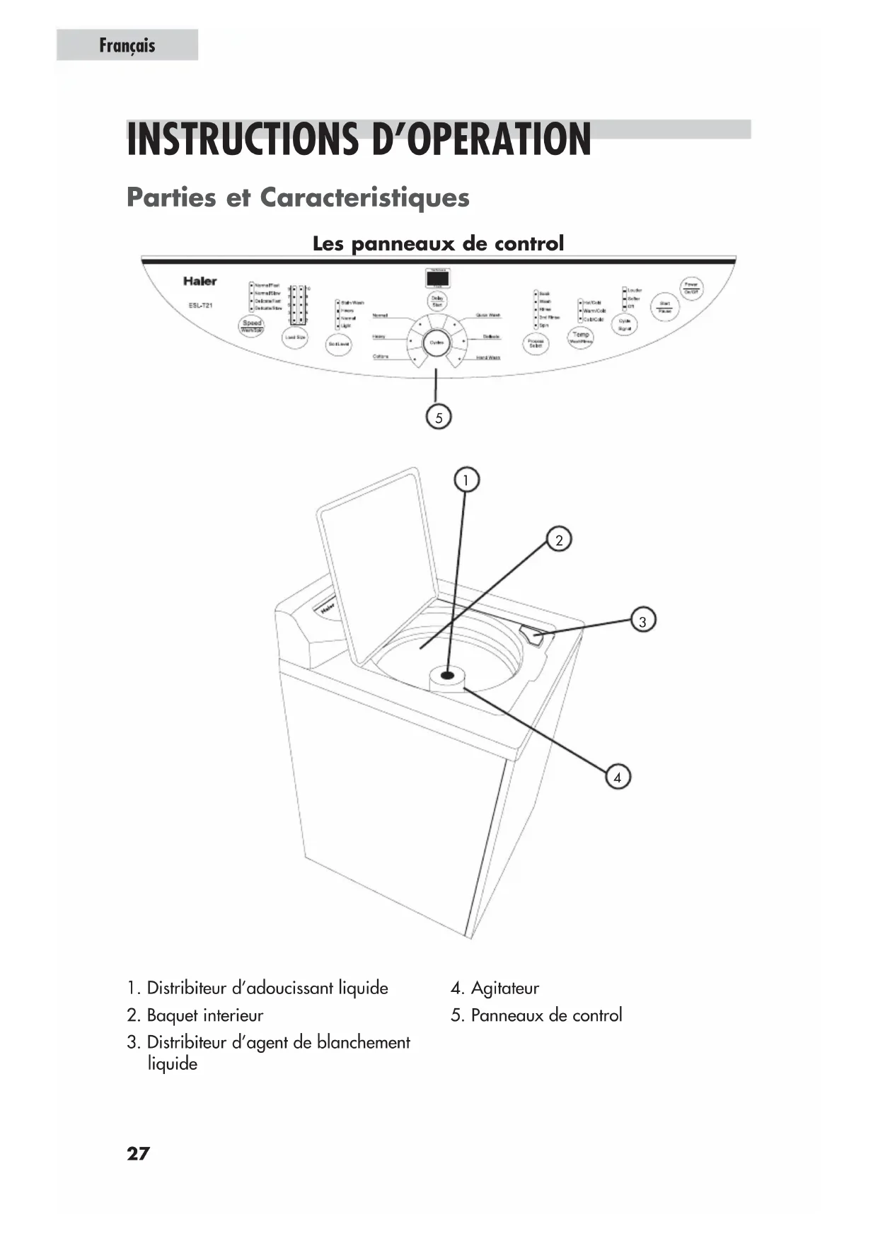 Français16.N’utilisez pas ce lave-linge pour des vetements commerciaux. 17.N’operez pas votre machine a moins que tous les panneaux de cloture sont convenablement en place. 18.N’alterez pas les controles. 19.Pour reduire les risques de blessures ne permettez pas aux enfants de jouer dans ou avec cet appareil. 20.Ce lave-linge doit etre connecte proprement a une sorite electrique avec la provision electrique exacte. 21.Propre mise a terre doit etre assuree afin d’eviter des risques de feu . NE PAS ENLEVER OU COUPER LE BOUCHON DE MISE A TERRE. Si vous n’avez pas un adapteur a 3 broches dans le mur, veuillez avoir un elec- tricien certifie installer un adapteur correcte. L’adapteur mural doit etre proprement mis a terre. 22.Le gaz d’hydrogene peut etre produit si l’appareil de chauffage d’eau n’a pas ete utilise dans plus de 2 semaines.Ceci peut etre explosif et peut explose sous certaines circonstances. Dans ce cas, avant d’utiliser votre lave-linge, ouvrez tous les robinets d’eau chaude et laissez l’eau ecouler pour quelque minutes. Ceci aidera au gaz d’hydrogene pris en piege de s’echapper.Pendant ce process, n’allumez pas des alumettes, ne fumez pas ne tournez pas un appareil elctrique pour eviter un accident comme le gaz d’hydrogene est inflammable et peut exploser. Gardez ces instructions Pour le Future Merci d’avoir utilise un produit Haier. Ce manuel facile a utiliser , vous guidera pour obtenir le meilleur resultat de votre machine. N’oubliez pas d’enregistrer votre numero de serie et model. Ils sont sur une etiquette au dos du lave-linge Numero du modelNumero de serieDate d’achat Agrafez votre recu d’achat a votre manuel. Vous en aurez besoin pour obtenir le service de garantie. DANGER Le risque d’entrappement des enfants. Avant de disposer de votre ancien lave-linge , enlevez les portes , comme ca les enfants ne seront pas mis au piege a l’interieur.