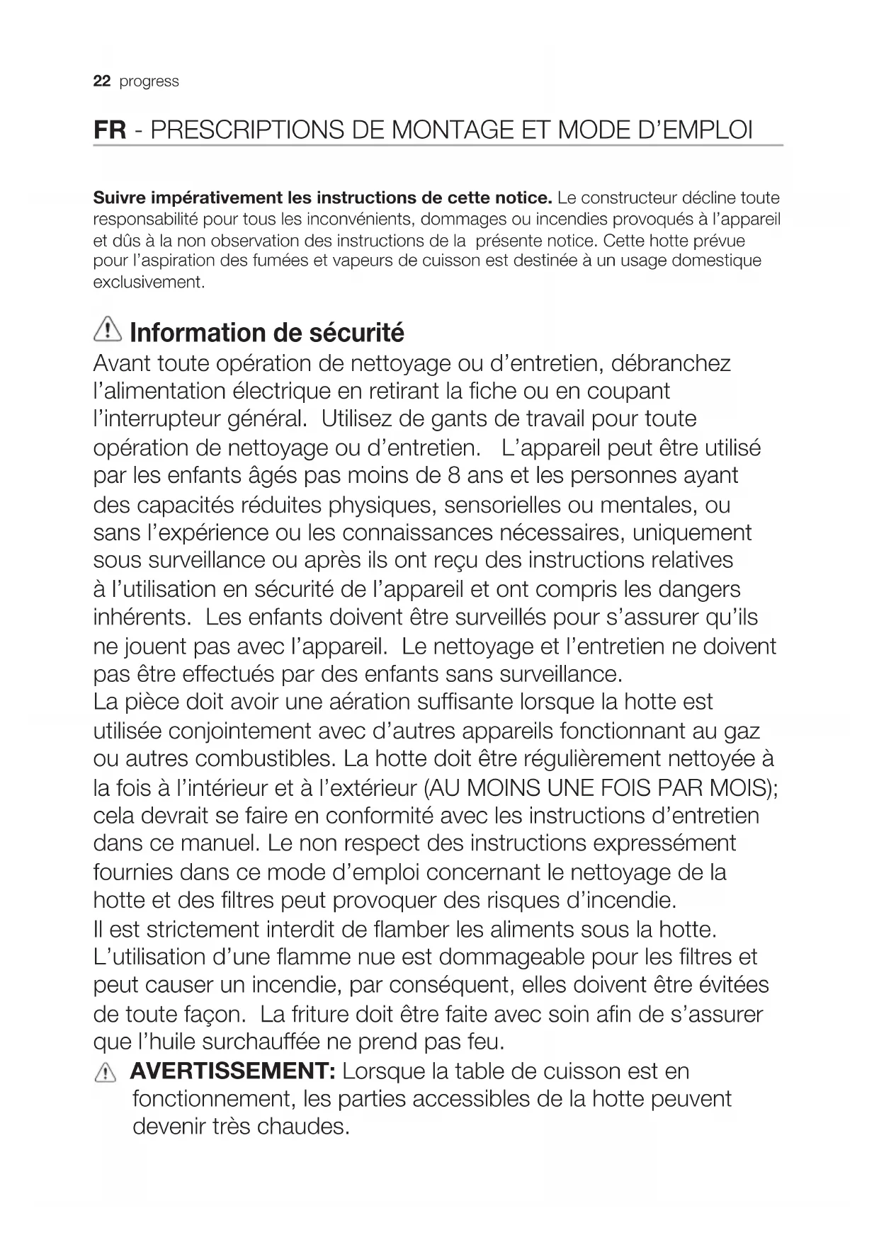fonctionnement, les parties accessibles de la hotte peuvent devenir très chaudes.progress 23 Consignes de sécurité Pour le remplacement de la lampe, utilisez uniquement le type de lampe spécifié dans la section remplacement/maintenance lampe dans ce manuel. Attention! Ne pas brancher l’appareil au réseau électrique avant que l’installation est complètement terminée. En ce qui concerne les mesures techniques et de sécurité à prendre pour l’évacuation des fumées, respectez strictement les dispositions des règlements locales. L’air d’évacuation ne doit pas être envoyé dans un conduit utilisé pour évacuer les fumées produites par les appareils de combustion de gaz ou d’autres combustibles. Ne pas utiliser ou laisser la hotte sans les lampes correctement montées, car un éventuel risque de choc électrique est possible. N’utilisez jamais la hotte sans la grille montée correctement! La hotte ne doit JAMAIS être utilisée comme une surface d’appui, sauf indication expresse. Utilisez uniquement les vis de fixation fournies avec le produit pour l’installation, ou, si non fournies, acheter le type correct de vis. Utilisez la longueur correcte pour les vis qui sont identifiées dans le Guide d’installation. En cas de doute, consultez votre centre de service agréé ou du personnel qualifié. Attention! Le défaut d’installer les vis et les dispositifs de fixation conformément à ces instructions peut entraîner des risques électriques. En matière de protection de l’environnement Recyclez les matériaux portant le symbole . Déposez les emballages dans les conteneurs prévus à cet effet. Contribuez à la protection de l’environnement et à votre sécurité, recyclez vos produits électriques et électroniques. Ne jetez pas les appareils portant le symbole avec les ordures ménagères. Emmenez un tel produit dans votre centre local de recyclage ou contactez vos services municipaux. Utilisation La hotte est réalisée de façon qu’elle puisse être utilisée en version aspirante à évacuation extérieure , ou filtrante à recyclage intérieur . Installation La tension électrique doit correspondre à la tension reportée sur la plaque signalétique située à l’intérieur de la hotte. Si une prise est présente, branchez la hotte dans une prise murale conforme aux normes en vigueur et placée dans une zone accessible également après l’installation. Si aucune prise n’est présente (raccordement direct au circuit électrique), ou si la prise ne se trouve pas dans une zone accessible également après l’installation, appliquez un disjoncteur normalisé pour assurer de débrancher complètement la hotte du circuit électrique en conditions de catégorie surtension III, conformément aux règlementations de montage. Avant de rebrancher le circuit de la hotte à l’alimentation électrique et d’en vérifier le fonctionnement correct, contrôlez toujours que le câble d’alimentation soit monté correctement.24 progress La distance minimum entre la superficie de support des récipients sur le dispositif de cuisson et la partie la plus basse de la hotte de cuisine ne doit pas être inférieure à 45cm dans le cas de cuisinières électriques et de 55cm dans le cas de cuisinières à gaz ou mixtes. Si les instructions d’installation du dispositif de cuisson au gaz spécifient une plus grande distance, il faut en tenir compte. Entretien Attention! Avant toute opération de nettoyage ou d’entretien, débrancher la hotte du circuit électrique en enlevant la prise ou en coupant l’interrupteur général de l’habitation. La hotte doit être régulièrement nettoyée à l’intérieur et à l’extérieur (au moins à la même fréquence que pour l’entretien des filtres à graisse). Pour le nettoyage, utiliser un chiffon humidifié avec un détergent liquide neutre. Ne pas utiliser de produit contenant des abrasifs. NE PAS UTILISER D’ALCOOL! Attention! Il y a risque d’incendie si vous ne respectez pas les instructions concernant le nettoyage de l’appareil et le remplacement ou le nettoyage du filtre. La responsabilité du constructeur ne peut en aucun cas être engagée dans le cas d’un endommagement du moteur ou d’incendie liés à un entretien négligé ou au non respect des consignes de sécurité précédemment mentionnées. Filtre anti-graisse - Le filtre anti-graisse doit être nettoyé une fois par mois avec des détergents non agressifs, à la main ou dans le lavevaisselle à faibles températures et cycle rapide. Le lavage du filtre antigraisse au lavevaisselle peut en provoquer la décoloration. Toutefois, les caractéristiques de filtrage ne seront en aucun cas modifiées. Filtre à charbon actif NON lavable La saturation du charbon actif se constate aprés un emploi plus ou mois long, selon la fréquence d’utilisation et la régularité du nettoyage du filtre à graisses. En tout cas, il est nécessaire de changer le filtre aprés, au maximum, quatre mois. IL NE PEUT PAS être nettoyé ou régénéré.progress 25 Commandes La hotte est équipée d’un panneau de contrôle doté d’une commande de vitesse d’aspiration et d’une commande d’éclairage du plan de cuisson. Utiliser la puissance d’aspiration maximum en cas de concentration très importante des vapeurs de cuisson. Nous conseillons d’allumer la hotte 5 minutes avant de commencer la cuisson et de la faire fonctionner encore pendant 15 minutes environ après avoir terminé la cuisson. Le bandeau de commandes de la hotte se trouve sur l’avant de l’appareil: