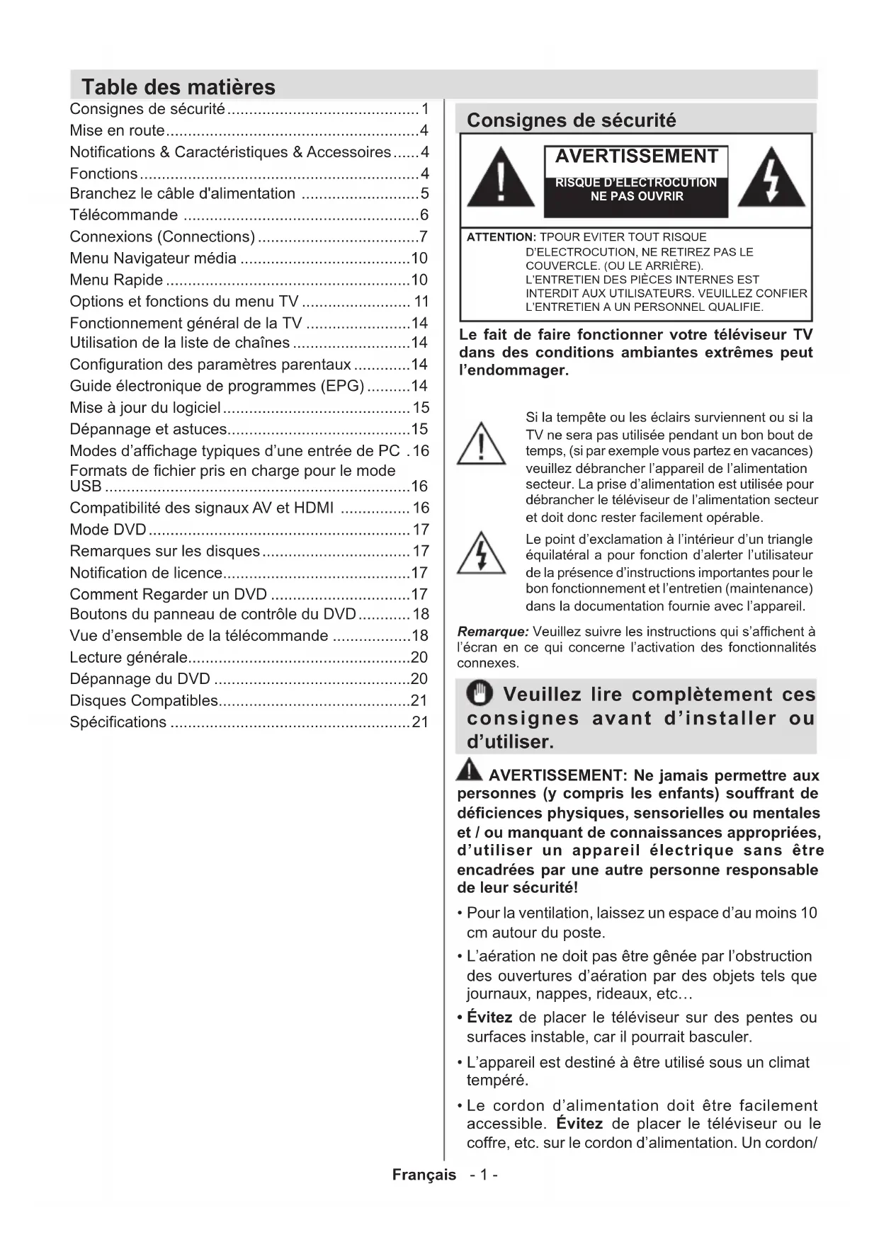- Les JPEG sont enregistrés sous la forme d’un signal numérique offrant une meilleure durabilité de la qualité d’image Pour que l'appareil fonctionne correctement, utiliser uniquement les disques de 12 cm. Spécications Types de disques pris en chargeDVD: SS/SL 4.7” (DVD-5)SS/DL 4.7” (DVD-9)DS/SL 4.7” (DVD-10) DS/DL 4.7” (DVD-18) CD-DA CD-R CD-RW MP-3/JPEG Type Vidéo Décodage vidéo standard MPEG-2 (prise en charge MPEG -1)720 x 576 (PAL) & 720 x 480 (NTSC) pixels d’afchage Vidéo en plein écranFréquences de rafraîchissement 50 et 60 Hz (PAL-NTSC)Vitesse de traitement du ux de données numériques pouvant atteindre 108Mbits/sec Résolution de lignes supérieure à 500 Type audio Décodage MPEG Multicanaux LPCM Sortie Audio Sortie analogique : Echantillonnage DAC 24 bits / 48, 44.1kHzEnglish - 22 - Contents Safety Information To operate your TV in extreme ambient conditions may cause the damage of the device. CAUTION RISK OF ELECTRIC SHOCKDO NOT OPENCAUTION: TO REDUCE THE RISK OF ELECTRIC SHOCK DO NOT REMOVE COVER (OR BACK). NO USER-SERVICEABLE PARTS INSIDE. REFER SERVICING TO QUALIFIED SERVICE PERSONNEL.Note : Follow the on screen instructions for operating the related features. If there is lightning or storms, or if the TV is not going to be used for a while (e.g. if going away on holiday), disconnect the TV set from the mains. The mains plug is used to disconnect TV set from the mains and therefore it must remain readily operable.The exclamation point within an equilateral triangle is intended to alert the user to the presence of important operating and maintenance (servicing) instructions in the literature accompanying the appliance. IMPORTANT - Please read these instructions fully before installing or operating
