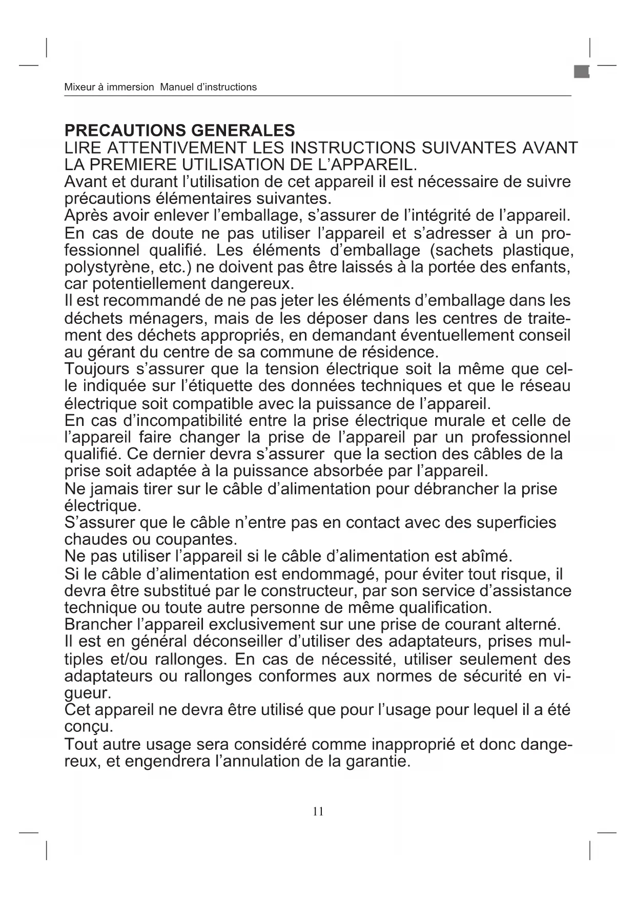 Si le cable d'alimentation est endommagé, pour éviter tout risque, il devra être substitué par le constructeur, par son service d'assistance technique ou toute autre personne de même qualification.