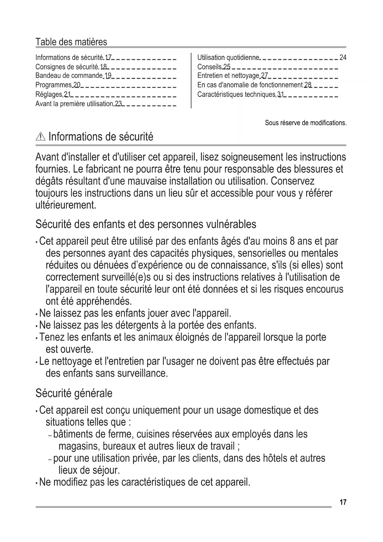 Conseils 25 Entretien et nettoyage 27 En cas d'anomalie de fonctionnement 28 Caractéristiques techniques 31 Sous réserve de modifications. Informations de sécurité Avant d'installer et d'utiliser cet appareil, lisez soigneusement les instructions fournies. Le fabricant ne pourra être tenu pour responsable des blessures et dégâts résultant d'une mauvaise installation ou utilisation. Conservez toujours les instructions dans un lieu sûr et accessible pour vous y référer ultérieurement. Sécurité des enfants et des personnes vulnérables