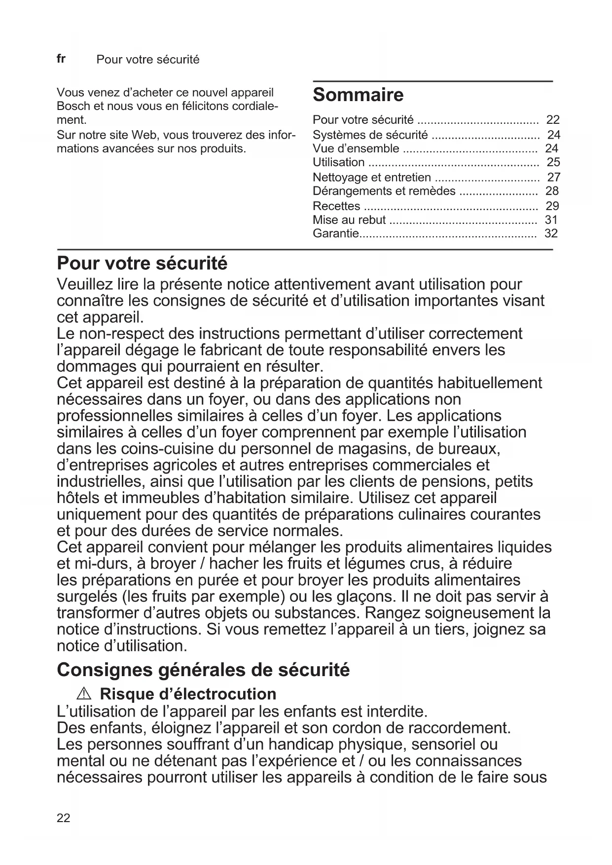 - Pour votre sécurité Veuillezlirelaprésentenoticeattentivementavantutilisationpour connaîtrelesconsignesdesécuritéetd’utilisationimportantesvisant cetappareil. Lenon-respectdesinstructionspermettantd’utilisercorrectement l’appareildégagelefabricantdetouteresponsabilitéenversles dommagesquipourraientenrésulter. Cetappareilestdestinéàlapréparationdequantitéshabituellement nécessairesdansunfoyer,oudansdesapplicationsnon professionnellessimilairesàcellesd’unfoyer.Lesapplications similairesàcellesd’unfoyercomprennentparexemplel’utilisation danslescoins-cuisinedupersonneldemagasins,debureaux, d’entreprisesagricolesetautresentreprisescommercialeset industrielles,ainsiquel’utilisationparlesclientsdepensions,petits hôtelsetimmeublesd’habitationsimilaire.Utilisezcetappareil uniquementpourdesquantitésdepréparationsculinairescourantes etpourdesduréesdeservicenormales. Cetappareilconvientpourmélangerlesproduitsalimentairesliquides etmi-durs,àbroyer/hacherlesfruitsetlégumescrus,àréduire lespréparationsenpuréeetpourbroyerlesproduitsalimentaires surgelés(lesfruitsparexemple)oulesglaçons.Ilnedoitpasservirà transformerd’autresobjetsousubstances.Rangezsoigneusementla noticed’instructions.Sivousremettezl’appareilàuntiers,joignezsa noticed’utilisation. Consignes générales de sécurité A Risque d’électrocution L’utilisationdel’appareilparlesenfantsestinterdite. Desenfants,éloignezl’appareiletsoncordonderaccordement. Lespersonnessouffrantd’unhandicapphysique,sensorielou mentalounedétenantpasl’expérienceet/oulesconnaissances nécessairespourrontutiliserlesappareilsàconditiondelefairesous Vousvenezd’achetercenouvelappareil Boschetnousvousenfélicitonscordiale- ment. SurnotresiteWeb,voustrouverezdesinfor- mationsavancéessurnosproduits. Sommaire Pourvotresécurité p. 22