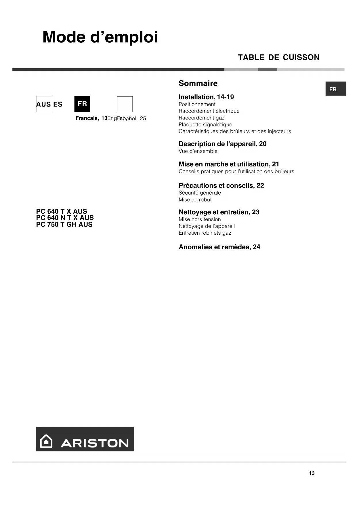 Sommaire Installation, 14-19 Positionnement Raccordement électrique Raccordement gaz Plaquette signalétique Caractéristiques des brûleurs et des injecteurs Description de l’appareil, 20 Vue d’ensemble Mise en marche et utilisation, 21 Conseils pratiques pour l’utilisation des brûleurs Précautions et conseils, 22 Sécurité générale Mise au rebut Nettoyage et entretien, 23 Mise hors tension Nettoyage de l’appareil Entretien robinets gaz Anomalies et remèdes, 24 Mode d’emploi Français, 13English,1 AUS ES
