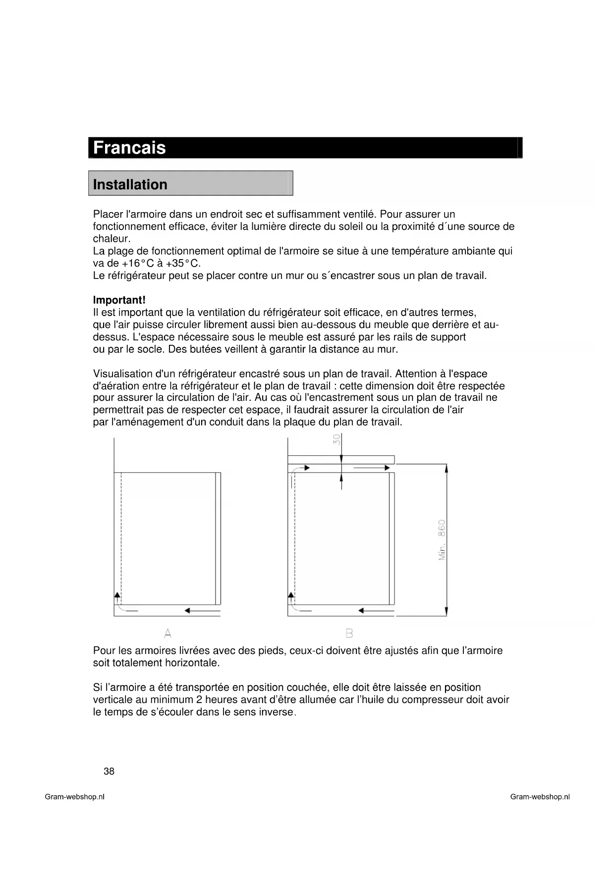 Installation Placer l'armoire dans un endroit sec et suffisamment ventilé. Pour assurer un fonctionnement efficace, éviter la lumière directe du soleil ou la proximité d´une source de chaleur. La plage de fonctionnement optimal de l'armoire se situe à une température ambiante qui va de +16°C à +35°C. Le réfrigérateur peut se placer contre un mur ou s´encastrer sous un plan de travail. Important! Il est important que la ventilation du réfrigérateur soit efficace, en d'autres termes, que l'air puisse circuler librement aussi bien au-dessous du meuble que derrière et au- dessus. L'espace nécessaire sous le meuble est assuré par les rails de support ou par le socle. Des butées veillent à garantir la distance au mur. Visualisation d'un réfrigérateur encastré sous un plan de travail. Attention à l'espace d'aération entre la réfrigérateur et le plan de travail : cette dimension doit être respectée pour assurer la circulation de l'air. Au cas où l'encastrement sous un plan de travail ne permettrait pas de respecter cet espace, il faudrait assurer la circulation de l'air par l'aménagement d'un conduit dans la plaque du plan de travail. Pour les armoires livrées avec des pieds, ceux-ci doivent être ajustés afin que l’armoire soit totalement horizontale. Si l’armoire a été transportée en position couchée, elle doit être laissée en position verticale au minimum 2 heures avant d’être allumée car l’huile du compresseur doit avoir le temps de s’écouler dans le sens inverse