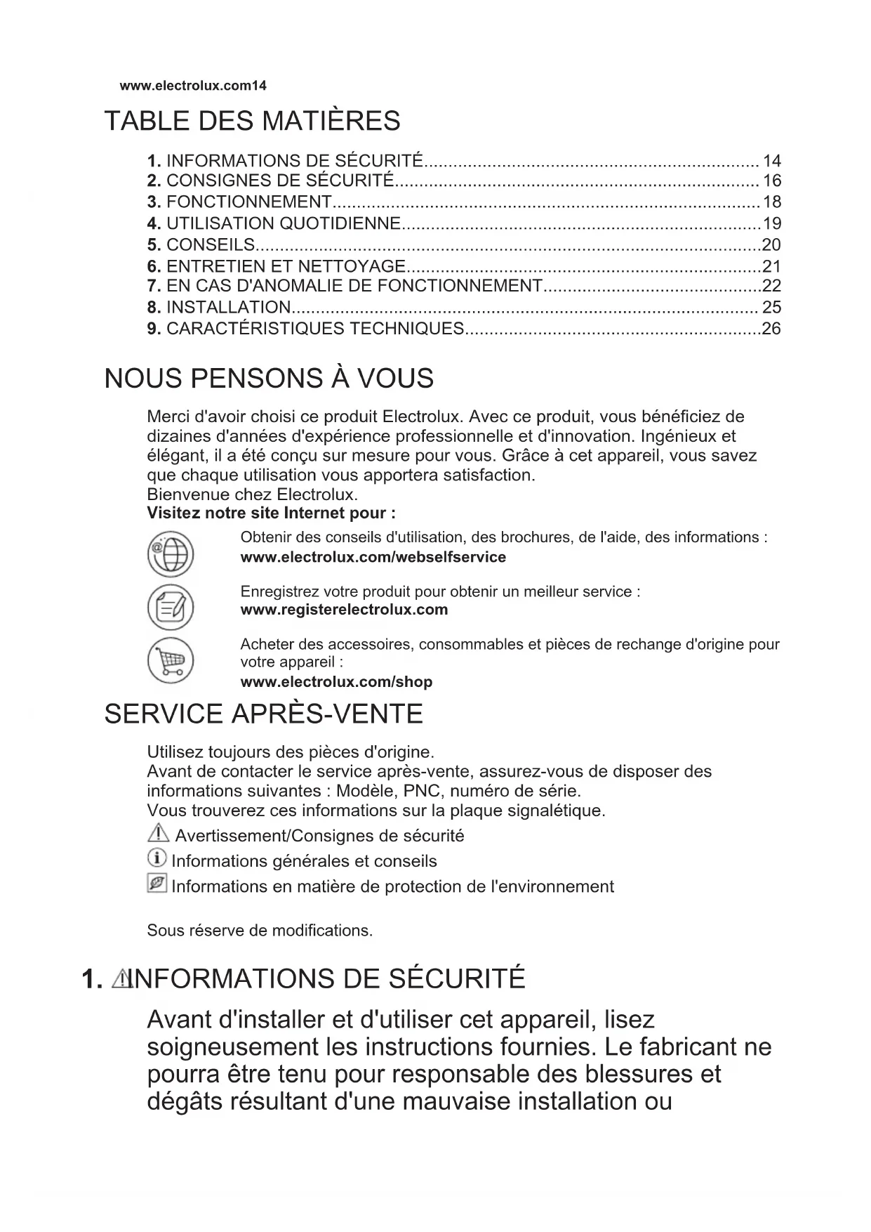 Avant d'installer et d'utiliser cet appareil, lisez soigneusement les instructions fournies. Le fabricant ne pourra être tenu pour responsable des blessures et dégâts résultant d'une mauvaise installation ou www.electrolux.com14utilisation. Conservez toujours les instructions dans un lieu sûr et accessible pour vous y référer ultérieurement.