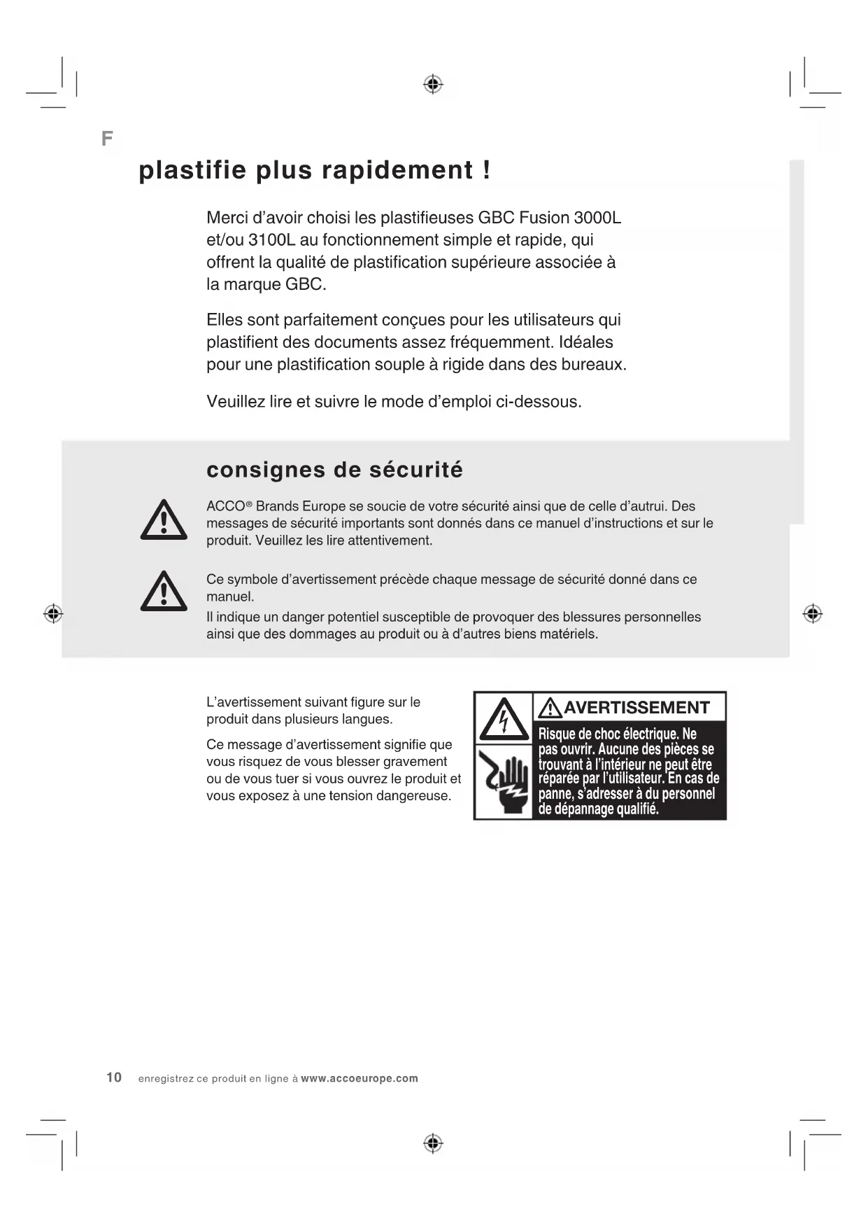 plastifie plus rapidement ! Merci d’avoir choisi les plastieuses GBC Fusion 3000L et/ou 3100L au fonctionnement simple et rapide, qui orent la qualité de plastication supérieure associée à la marque GBC.Elles sont parfaitement conçues pour les utilisateurs qui plastient des documents assez fréquemment. Idéales pour une plastication souple à rigide dans des bureaux.Veuillez lire et suivre le mode d’emploi ci-dessous.Risque de choc électrique. Ne pas ouvrir. Aucune des pièces se trouvant à l’intérieur ne peut être réparée par l’utilisateur. En cas de panne, s’adresser à du personnel de dépannage qualié. AVERTISSEMENT