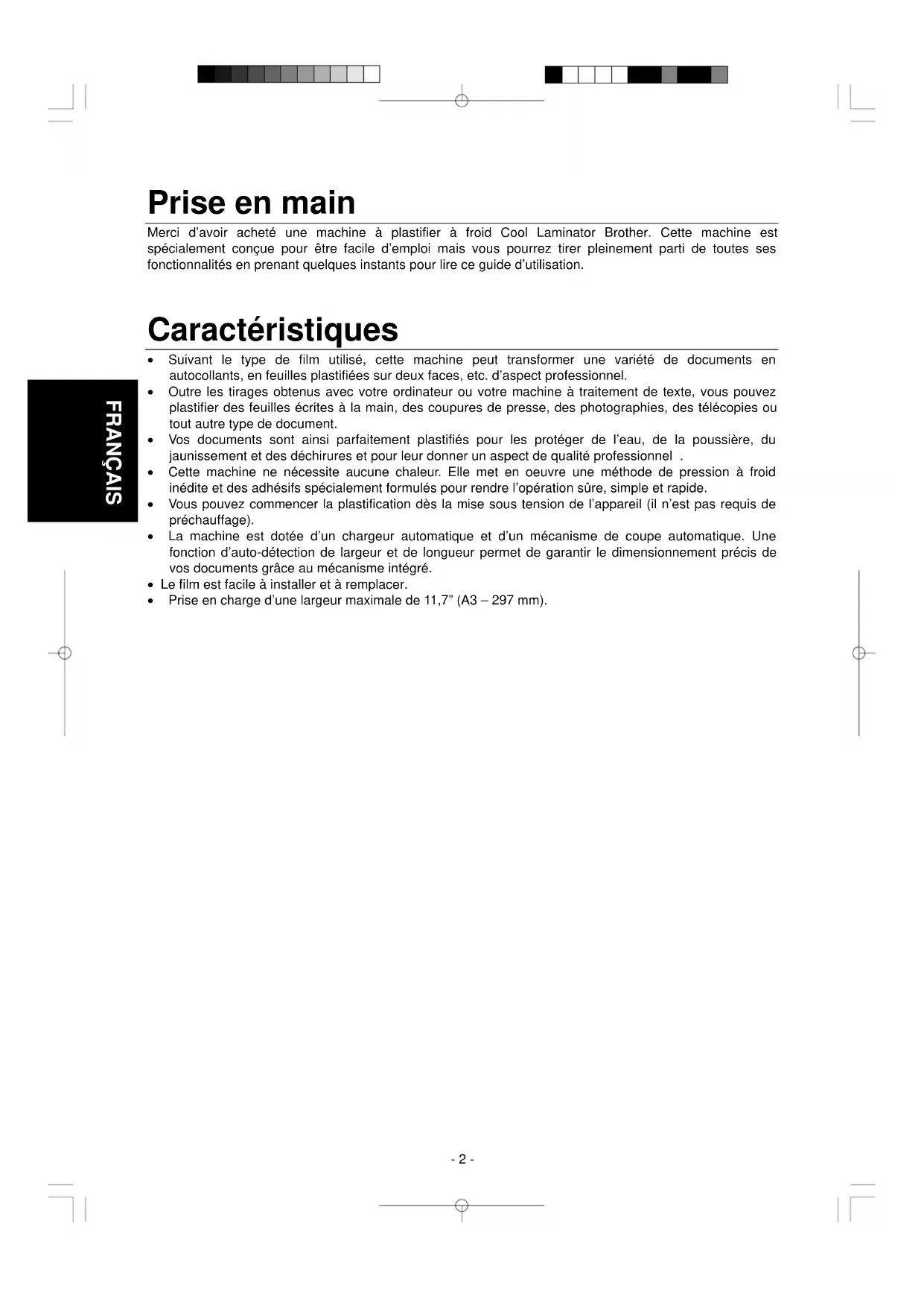 Désignation des pièces Extérieur de la machine Connecteur DC Situé à gauche au dos de la machine. Pour le branchement de l’adaptateur secteur. Capot supérieur Pour remplacer la cartouche de film et les lames de coupe. Fenêtre de visualisation Située sur le capot supérieur. Permet de vérifier que le type de film adéquat est chargé dans l’appareil. Porte-documents L’endroit où vous devez placer les documents à plastifier. Support de document Soutient le document à insérer. Guide de document Permet d’aligner le bord gauche du papier pour garantir l’insertion correcte du document. Cache de porte-documents Se soulève facilement pour retirer les documents de petite taille. Panneau de commande Interrupteur d‘alimentation et zone des touches de fonction. Sortie de document Endroit où le document est éjecté de la machine. Fente de coupe d’arrondis Vous permet de couper les coins de votre document à l’issue de la plastification. Les coins d’un document sont coupés automatiquement lorsqu’il est inséré dans la fente de coupe d’arrondis. Plateau de coupe d’arrondis Le coin du document plastifié est placé sur ce plateau afin de le positionner dans la fente de coupe d’arrondis. Collecteur de découpe Recueille les découpes de coupe d’arrondis. Adaptateur secteur S’enfiche dans une prise électrique et dans le connecteur DC de la machine. Intérieur de la machine Cartouche de film Contient le rouleau de film. L’étiquette figurant sur la cartouche permet d’identifier le type de film. Cette machine permet l’emploi de cartouches LC d’une largeur 12,0 pouces (A3), 9,0 pouces (A4) ou 4,8 pouces (A6). Levier de blocage Permet de bloquer/débloquer le porte-rouleau. Porte-rouleau Sert de support au rouleau. Bras de lame verticale Bras de la lame de coupe verticale. Lames de coupe verticale Lames destinées à la coupe verticale. Lames de coupe sup/inf. Lames destinées à la coupe supérieure/inférieure (horizontale). Rouleau Alimente le document dans l’appareil. Guide de document Support de document Porte-documents Fenêtre de visualisation Panneau de commande Fente de coupe en coin Collecteur de découpe Sortie de document Capot supérieur Connecteur DC Cartouche de film Porte-rouleau Bras de lame latérale Lames de coupe supérieure/inférieure Bouton de blocage Rouleau Lames de coupe latérale Plateau de coupe d’arrondis Cache de porte-documents- 6 - FRANÇAIS Panneau de commande BOUTON D’ALIMENTATION Met la machine sous tension ou hors tension. Touche Cut Coupe le document à la position courante. Touche Feed Permet d’alimenter le film plastifié et/ou le document. Touche Continuous Servez-vous de cette touche pour plastifier plusieurs documents. Extra Border (Marge en +) Servez-vous de cette touche pour créer une marge supplémentaire sur un côté de votre document (par ex. la zone de perforation à 3 trous). Touche Start Permet de lancer une opération. Touche Stop Permet d’arrêter une opération. Border (marge) La machine coupera le film en laissant une marge d’environ 0,18” (4,5 mm) sur tous les bords du document - (laisse une marge de film plastifié). No Border (sans marge) La machine coupera le film en laissant une marge d’environ 0,06” (1,5 mm) sur tous les bords du document – (coupe le film plastifié au ras du document.) Cutter Off Désactive le mode de coupe automatique. Error Signale une anomalie de la machine. Bouton de volet Volet Ligne de coupe Fente de film Cartouche de film Ligne de coupe Coupe l’excès de film au niveau de cette ligne pour permettre d’installer la cartouche correctement. Volet Soulève le volet pour ouvrir le couvercle de la cartouche de film. Bouton de volet Verrouille le couvercle de la cartouche de film et ramène le volet à sa position d’origine. Fente de film Le bord supérieur du film apparaît dans la fente. Recharges de film en option ONON OFF Cutter OffPOWERNo BorderBorder StartStop Error Feed Cut ContinuousExtra BorderFRANÇAIS