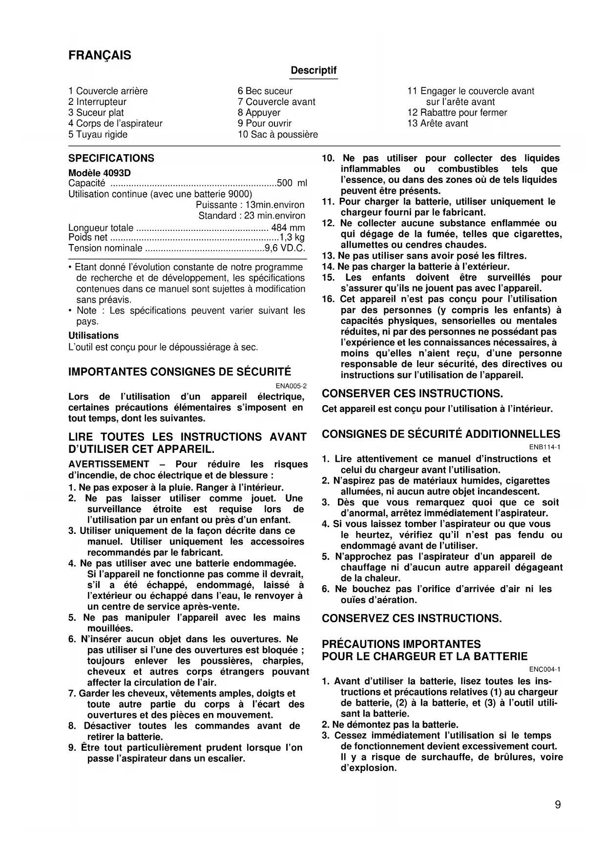 - Various type of Makita genuine batteries and chargers9 FRANÇAIS Descriptif 1 Couvercle arrière 2 Interrupteur 3 Suceur plat 4 Corps de l’aspirateur 5 Tuyau rigide 6 Bec suceur 7 Couvercle avant 8 Appuyer 9 Pour ouvrir 10 Sac à poussière 11 Engager le couvercle avant sur l’arête avant 12 Rabattre pour fermer 13 Arête avant SPECIFICATIONS Modèle 4093D Capacité ................................................................500 ml Utilisation continue (avec une batterie 9000) Puissante : 13min.environ Standard : 23 min.environ Longueur totale ................................................... 484 mm Poids net .................................................................1,3 kg Tension nominale ..............................................9,6 VD.C.