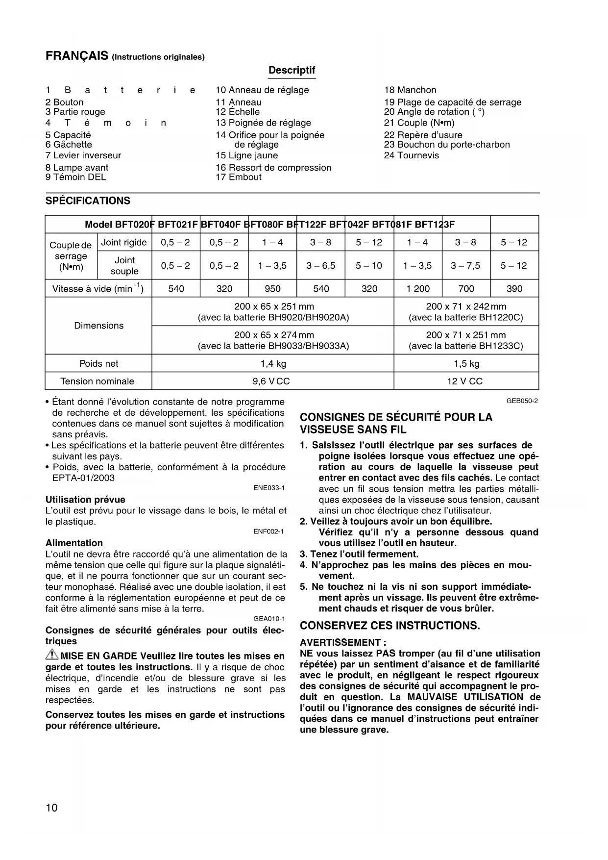 - Poids, avec la batterie, conformément à la procédure EPTA-01/2003 ENE033-1 Utilisation prévue L’outil est prévu pour le vissage dans le bois, le métal et le plastique. ENF002-1 Alimentation L’outil ne devra être raccordé qu’à une alimentation de la même tension que celle qui figure sur la plaque signaléti- que, et il ne pourra fonctionner que sur un courant sec- teur monophasé. Réalisé avec une double isolation, il est conforme à la réglementation européenne et peut de ce fait être alimenté sans mise à la terre. GEA010-1 Consignes de sécurité générales pour outils élec- triques MISE EN GARDE Veuillez lire toutes les mises en garde et toutes les instructions. Il y a risque de choc électrique, d’incendie et/ou de blessure grave si les mises en garde et les instructions ne sont pas respectées. Conservez toutes les mises en garde et instructions pour référence ultérieure. GEB050-2