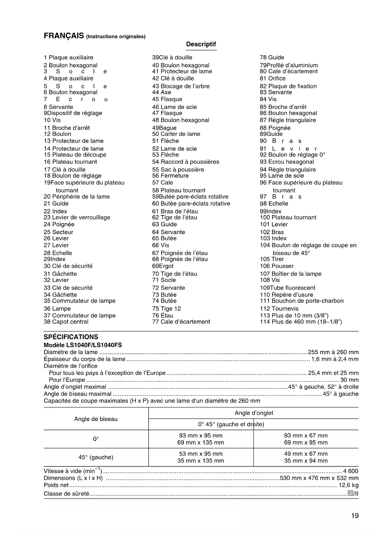 - 8 Echelle 99 Index 100 Plateau tournant 101 Levier 102 Bras 103 Index 104 Boulon de réglage de coupe en biseau de 45° 105 Tirer 106 Pousser 107 Boîtier de la lampe 108 Vis 109 Tube fluorescent 110 Repère d’usure 111 Bouchon de porte-charbon 112 Tournevis 113 Plus de 10 mm (3/8”) 114 Plus de 460 mm (18–1/8”) SPÉCIFICATIONS Modèle LS1040F/LS1040FS Diamètre de la lame p. 255