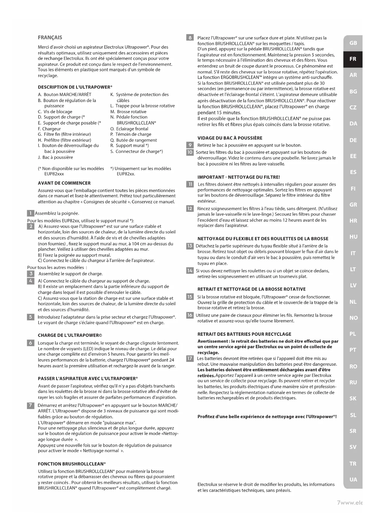 bac à poussière J. Bac à poussière (* Non disponible sur les modèles EUP82xxx K. Système de protection des câbles L. Trappe pour la brosse rotative M. Brosse rotative N. Pédale fonction BRUSHROLLCLEAN® O. Eclairage frontal P. Témoin de charge Q. Butée de rangement R. Support mural *) S. Connecteur de charge*) *) Uniquement sur les modèles EUP82xx.