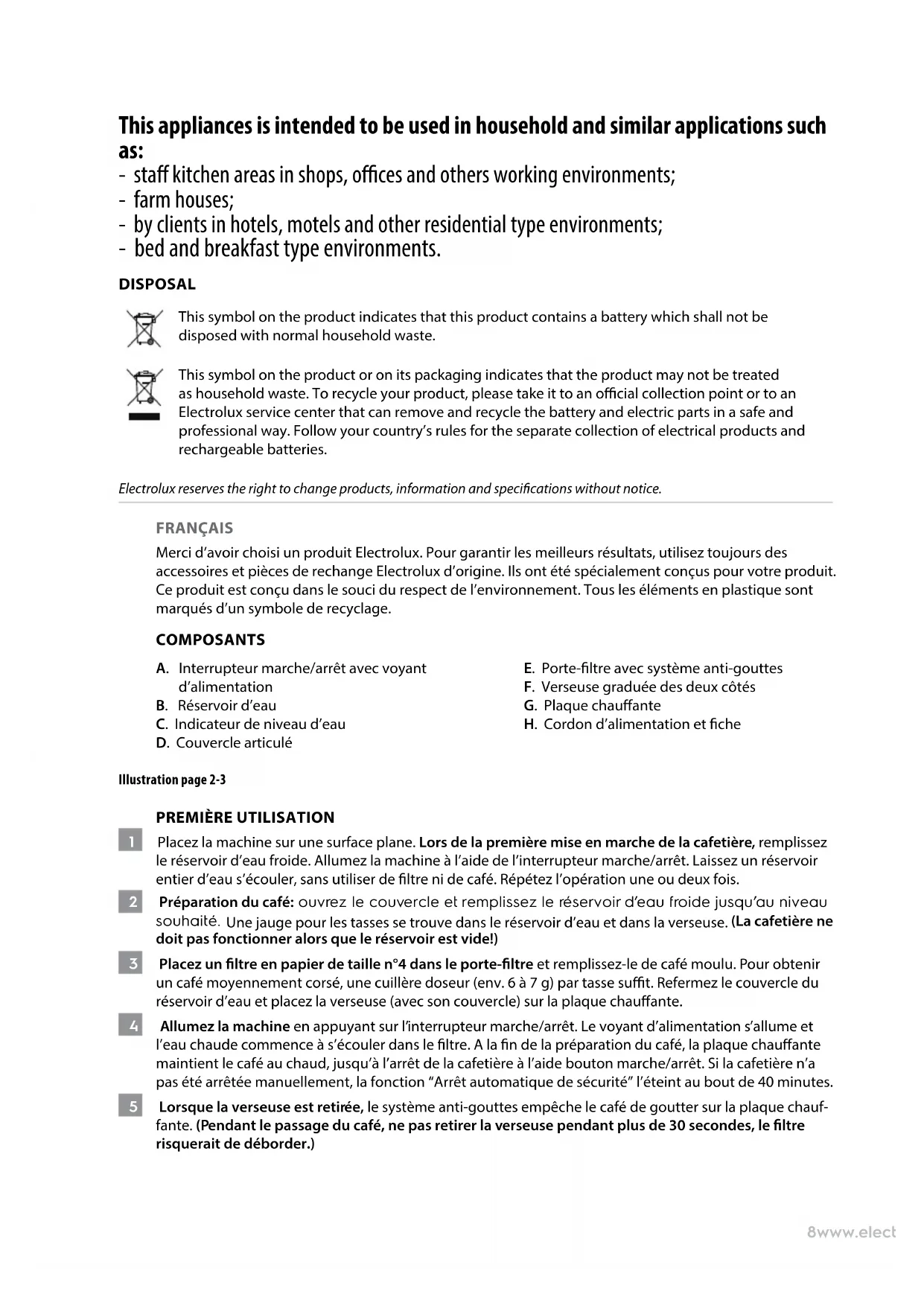 1 Placez la machine sur une surface plane. Lors de la première mise en marche de la cafetière, remplissez le réservoir d’eau froide. Allumez la machine à l’aide de l’interrupteur marche/arrêt. Laissez un réservoir entier d’eau s’écouler, sans utiliser de ltre ni de café. Répétez l’opération une ou deux fois. 2 Préparation du café: ouvrez le couvercle et remplissez le réservoir d’eau froide jusqu’au niveau souhaité. Une jauge pour les tasses se trouve dans le réservoir d’eau et dans la verseuse. (La cafetière ne doit pas fonctionner alors que le réservoir est vide!) 3 Placez un ltre en papier de taille n°4 dans le porte-ltre et remplissez-le de café moulu. Pour obtenir un café moyennement corsé, une cuillère doseur (env. 6 à 7g) par tasse sut. Refermez le couvercle du réservoir d’eau et placez la verseuse (avec son couvercle) sur la plaque chauante. 4 Allumez la machine en appuyant sur l’interrupteur marche/arrêt. Le voyant d’alimentation s’allume et l’eau chaude commence à s’écouler dans le ltre. A la n de la préparation du café, la plaque chauante maintient le café au chaud, jusqu’à l’arrêt de la cafetière à l’aide bouton marche/arrêt. Si la cafetière n’a pas été arrêtée manuellement, la fonction “Arrêt automatique de sécurité” l’éteint au bout de 40 minutes. 5 Lorsque la verseuse est retirée, le système anti-gouttes empêche le café de goutter sur la plaque chauf- fante. (Pendant le passage du café, ne pas retirer la verseuse pendant plus de 30secondes, le ltre risquerait de déborder.)9www.electrolux.com