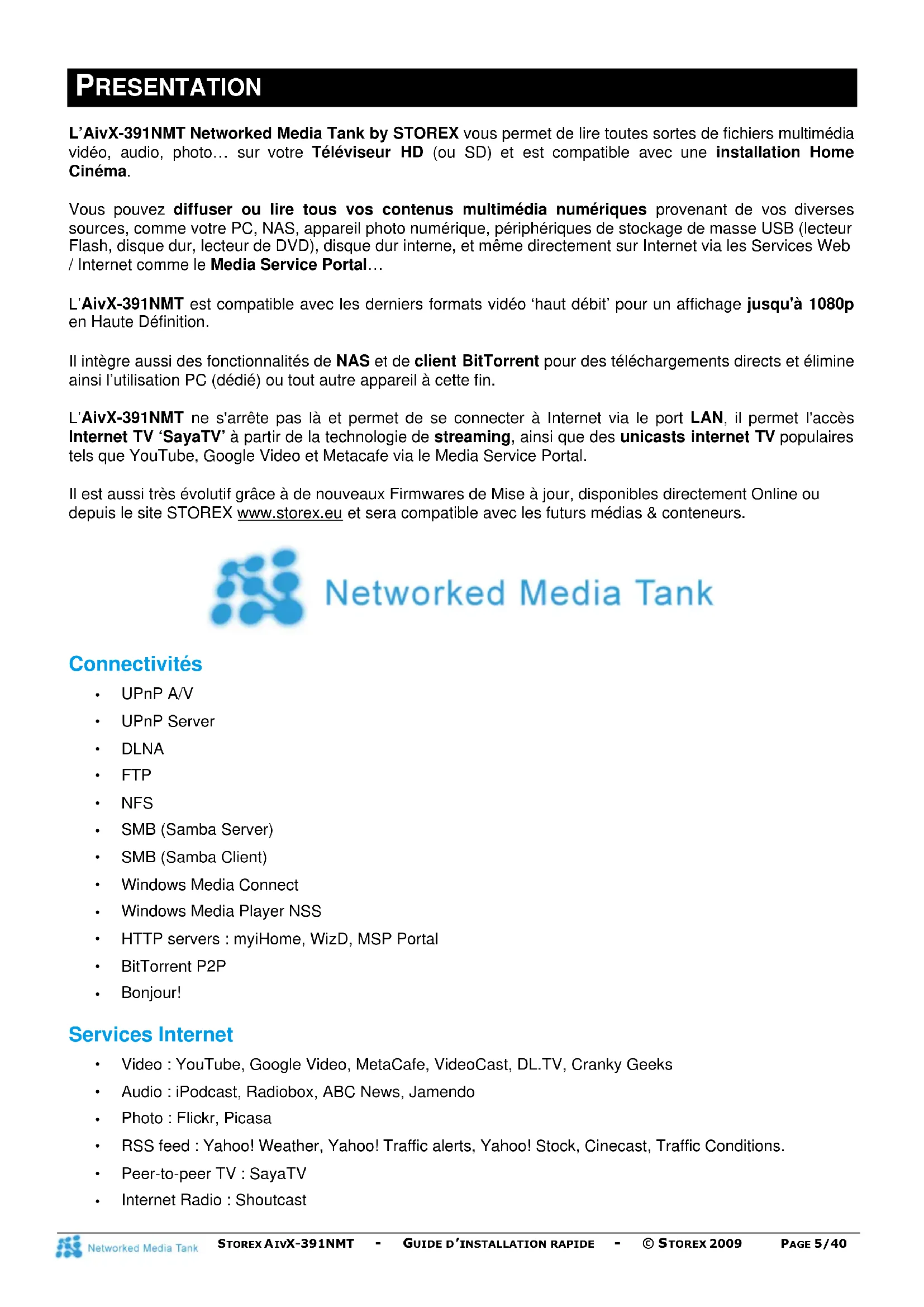 AGE 5/40 PRESENTATION L’AivX-391NMT Networked Media Tank by STOREX vous permet de lire toutes sortes de fichiers multimédia vidéo, audio, photo… sur votre Téléviseur HD (ou SD) et est compatible avec une installation Home Cinéma. Vous pouvez diffuser ou lire tous vos contenus multimédia numériques provenant de vos diverses sources, comme votre PC, NAS, appareil photo numérique, périphériques de stockage de masse USB (lecteur Flash, disque dur, lecteur de DVD), disque dur interne, et même directement sur Internet via les Services Web / Internet comme le Media Service Portal… L’AivX-391NMT est compatible avec les derniers formats vidéo ‘haut débit’ pour un affichage jusqu'à 1080p en Haute Définition. Il intègre aussi des fonctionnalités de NAS et de client BitTorrent pour des téléchargements directs et élimine ainsi l’utilisation PC (dédié) ou tout autre appareil à cette fin. L’AivX-391NMT ne s'arrête pas là et permet de se connecter à Internet via le port LAN, il permet l'accès Internet TV ‘SayaTV’ à partir de la technologie de streaming, ainsi que des unicasts internet TV populaires tels que YouTube, Google Video et Metacafe via le Media Service Portal. Il est aussi très évolutif grâce à de nouveaux Firmwares de Mise à jour, disponibles directement Online ou depuis le site STOREX www.storex.eu et sera compatible avec les futurs médias & conteneurs. Connectivités