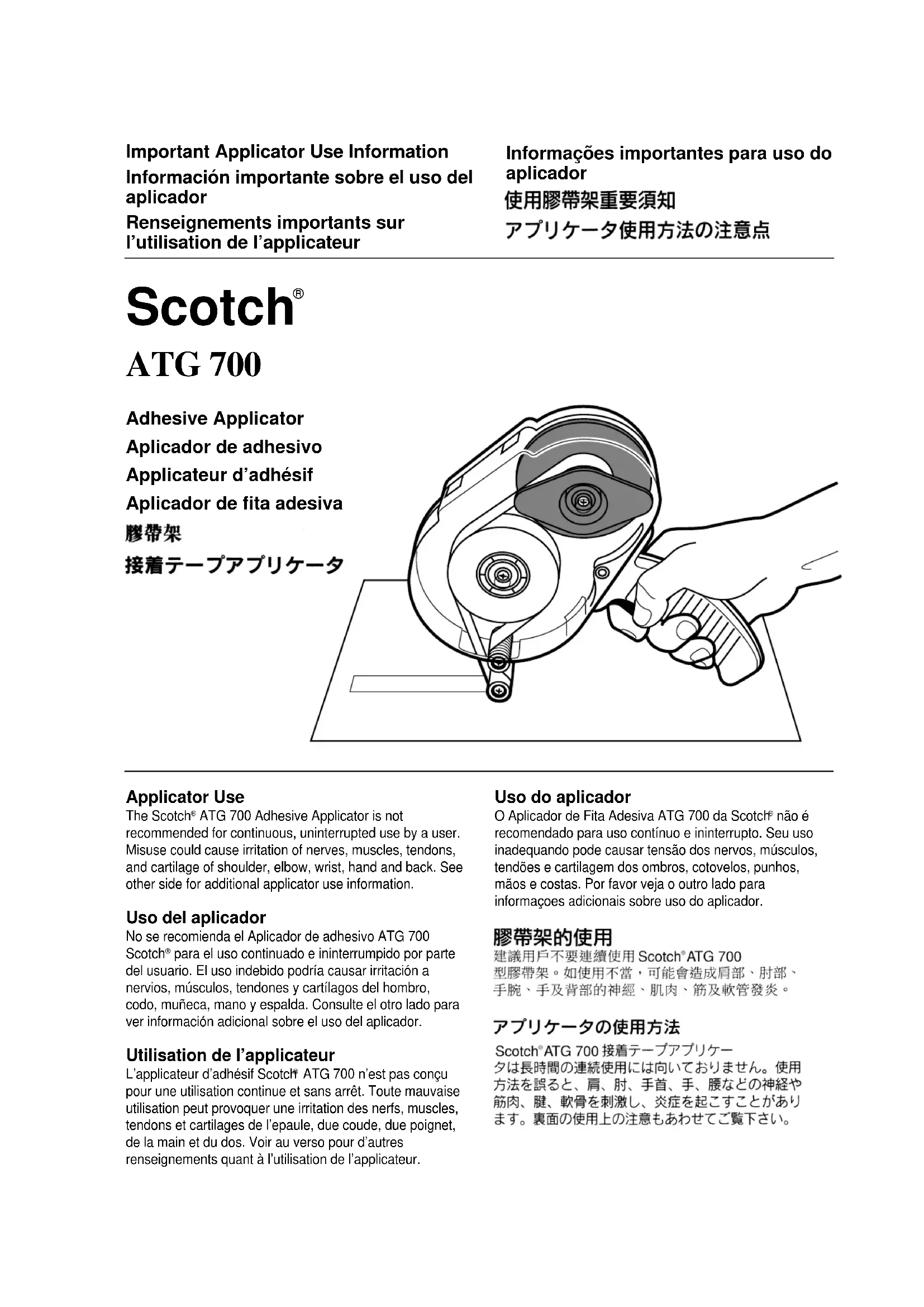 ATG 700 n’est pas conçu pour une utilisation continue et sans arrêt. Toute mauvaise utilisation peut provoquer une irritation des nerfs, muscles, tendons et cartilages de l’epaule, due coude, due poignet, de la main et du dos. Voir au verso pour d’autres renseignements quant à l’utilisation de l’applicateur. Uso do aplicador O Aplicador de Fita Adesiva ATG 700 da Scotch