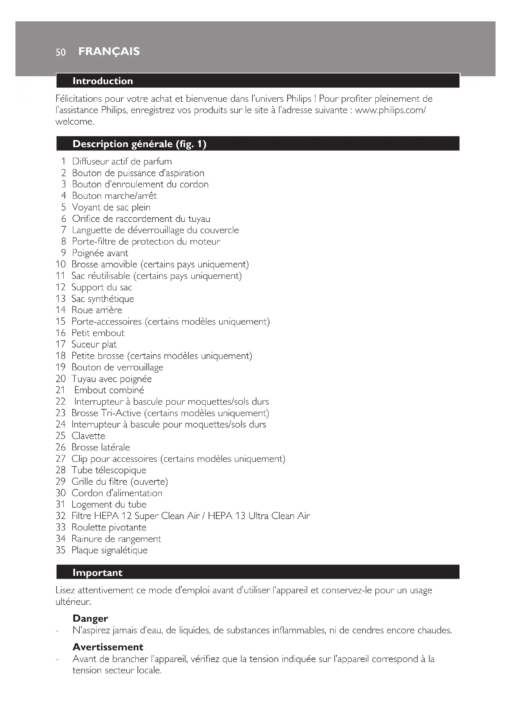suomi 4950 Introduction Félicitations pour votre achat et bienvenue dans l’univers Philips ! Pour proter pleinement de l’assistance Philips, enregistrez vos produits sur le site à l’adresse suivante : www.philips.com/ welcome. Description générale (g. 1) 1 Diffuseur actif de parfum 2 Bouton de puissance d’aspiration 3 Bouton d’enroulement du cordon 4 Bouton marche/arrêt 5 Voyant de sac plein 6 Orice de raccordement du tuyau 7 Languette de déverrouillage du couvercle 8 Porte-ltre de protection du moteur 9 Poignée avant 10 Brosse amovible (certains pays uniquement) 11 Sac réutilisable (certains pays uniquement) 12 Support du sac 13 Sac synthétique 14 Roue arrière 15 Porte-accessoires (certains modèles uniquement) 16 Petit embout 17 Suceur plat 18 Petite brosse (certains modèles uniquement) 19 Bouton de verrouillage 20 Tuyau avec poignée 21 Embout combiné 22 Interrupteur à bascule pour moquettes/sols durs 23 Brosse Tri-Active (certains modèles uniquement) 24 Interrupteur à bascule pour moquettes/sols durs 25 Clavette 26 Brosse latérale 27 Clip pour accessoires (certains modèles uniquement) 28 Tube télescopique 29 Grille du ltre (ouverte) 30 Cordon d’alimentation 31 Logement du tube 32 Filtre HEPA 12 Super Clean Air / HEPA 13 Ultra Clean Air 33 Roulette pivotante 34 Rainure de rangement 35 Plaque signalétique Important Lisez attentivement ce mode d’emploi avant d’utiliser l’appareil et conservez-le pour un usage ultérieur. Danger N’aspirez jamais d’eau, de liquides, de substances inammables, ni de cendres encore chaudes. Avertissement Avant de brancher l’appareil, vériez que la tension indiquée sur l’appareil correspond à la tension secteur locale.